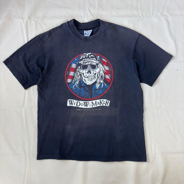 1987年製 サイズ/XL 肩幅/49cm 身幅/51cm 着丈/61cm シングルステッチ HANESボディ 1980年代のバイカーTシャツです。 カルト的な人気を誇る”HOG BROS”によるこちらは、”Patterson”というアーティストによるグラフィックがインパクト抜群。Easyriders誌の巻末の通販コーナーでも知られ、数多くのカルト的デザインを世に送った玄人好みなアーティスト。 “Widow Maker”(寡婦/未亡人製造機)、即ち危険な乗り物に乗るバイカーを表現するフレーズと共に描かれるスカルのデザインは、往年のバイカーT然りの仕上がり。 背面にはチョッパーに跨るバイカー達と共にHog/豚が描かれたオリジナルデザインのプリント。 ボディ全体のフェード感は抜群で、グレーがかった美しい褪色感は正にビンテージのそれ。 褪色によるボディの色斑は見えますが、致命的なダメージはございません。