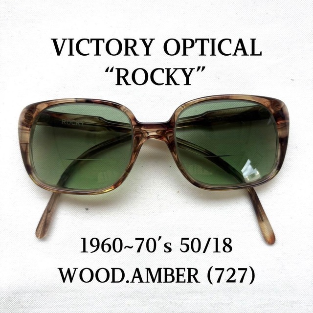 1960~70’s サイズ 50/18 フレーム幅/約127mm フレーム縦幅/約43mm テンプル/約121mm 遠近両用グリーンレンズ入り NEG-727 アメリカ東海岸に存在した知る人ぞ知る玄人好みなブランド”VICTORY OPTICAL”社製のフレーム、”Rocky”です。 大振りなスクエア系のフレームにウッド調のクリアアンバーカラーが美しい一本。 ブランドらしい独創的かつエッジーなディテールに加え、ビンテージならではの雰囲気溢れる市場にはほとんど出回らない一本です。 年代なりの小傷、テンプルのたわみは見えますが、艶感も残る良好なコンディションです。 元々流通数が少ないブランドかつモデルです。市場に出回る機会も少ないかと思いますので、是非ご検討下さい。