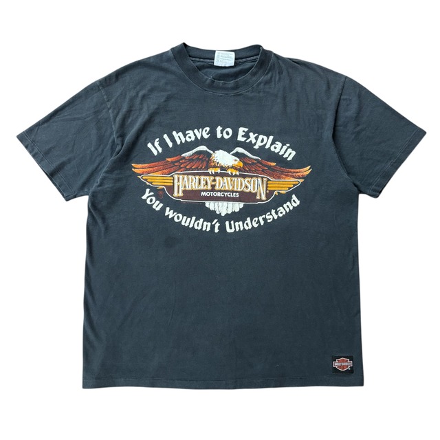 1989年代 サイズ/XL 肩幅/50cm 身幅/57cm 着丈/66.5m シングルステッチ アメリカ製 R.K.STRATMAN製 数あるハーレーダビッドソンのビンテージTの中でも非常に人気の高いデザインの1つです。 ”If I have to explain, You wouldn’t understand” (ハーレーの魅力を)説明したとしても、あなたは理解できないよ。 というメッセージ性に溢れたフレーズがプリントされており、イーグルのプリントも相まって、王道のハーレー、バイカーTシャツと言えます。 最近ではインフルエンサーの着用もあり、一気に人気が高まったデザインです。 バックにはカリフォルニア州Santa Anaのディーラープリントが施されており、フライングウィール、南カリフォルニアらしいコーストラインやパームツリーなど、両面共に抜群のプリント。 程よくフェードした抜群のコンディションです。