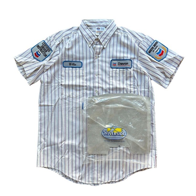 1990年代製 サイズ/XL相当 肩幅/51cm 身幅/67cm 着丈/84.5cm RIVERSIDE社ボディ MADE IN USA デッドストックコンディション 1990年代頃のものと見えるCHEVRON社のワークシャツです。 アメリカの石油、エネルギー系企業であるシェブロンはそのキャッチーなロゴ、また旅を思わせる性格から、モーター系や企業系のジャンルとして幅広い層に人気を誇ります。 こちらは同社のトラックドライバー用のユニフォームと見えます。ボディにはこの年代のワークウェアやキャップ等で時折見かけるRIVERSIDE社のものが用いられています。 両胸と両肩に施されたワッペン、またトリコロールカラーのストライプ等、アメリカ古着らしい存在感ある仕上がりです。 またベースの生成り系の色味の雰囲気が抜群。 製造時、または保管時のものと思われるシミがポケット横に見えますが、袋に梱包状態のままのデッドストックコンディションです。