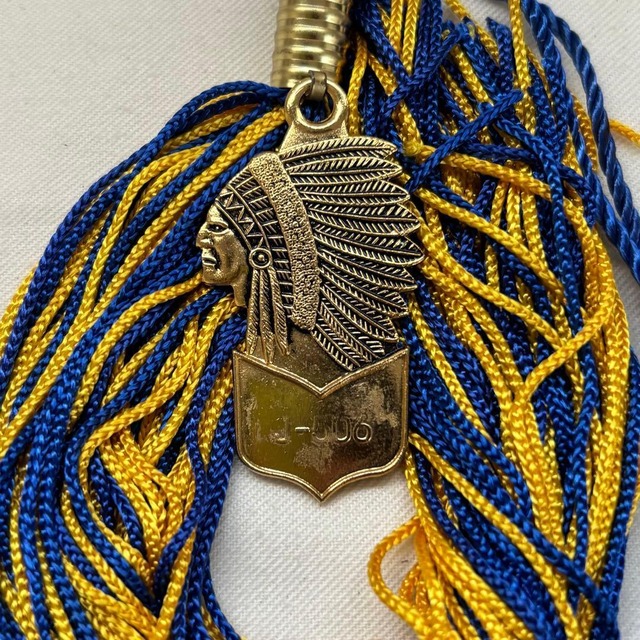 1970~80s サイズ/キーホルダー部分:約5mm x 25mm フリンジ:約208mm 1970~80年代頃のものと見える、ネイティブアメリカンの首長/チーフヘッドを模った、タッセルチャームです。 ブラス製と見える金色の艶が雰囲気良好。 チーフヘッドの羽の造形まで細かく表現された精巧な作りも魅力的。 カレッジ、もしくは軍関連の記念品と見えます。