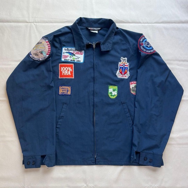 1980年代 サイズ/XXL 裄丈 /92cm 身幅/71.5cm 着丈/71cm SPORTSMASTER社製 1980年代頃のSPORTSMASTER社製の所謂スウィングトップ、ドリズラージャケットです。 この手のシルエットのジャケットでは最も著名なブランドの1つ。 襟、ハンドウォーマー付きのミニマムなシルエットはビンテージアイテムにおける王道であり、着る人を選ばない普遍的な1枚です。 ジャケットのあらゆる場所に州のスーベニア系、フィッシング、アウトドア、MLB、ミリタリーと言った様々なワッペンが施された雰囲気抜群の一点。 胸元にやや織傷が見えますが、良好なコンディションです。