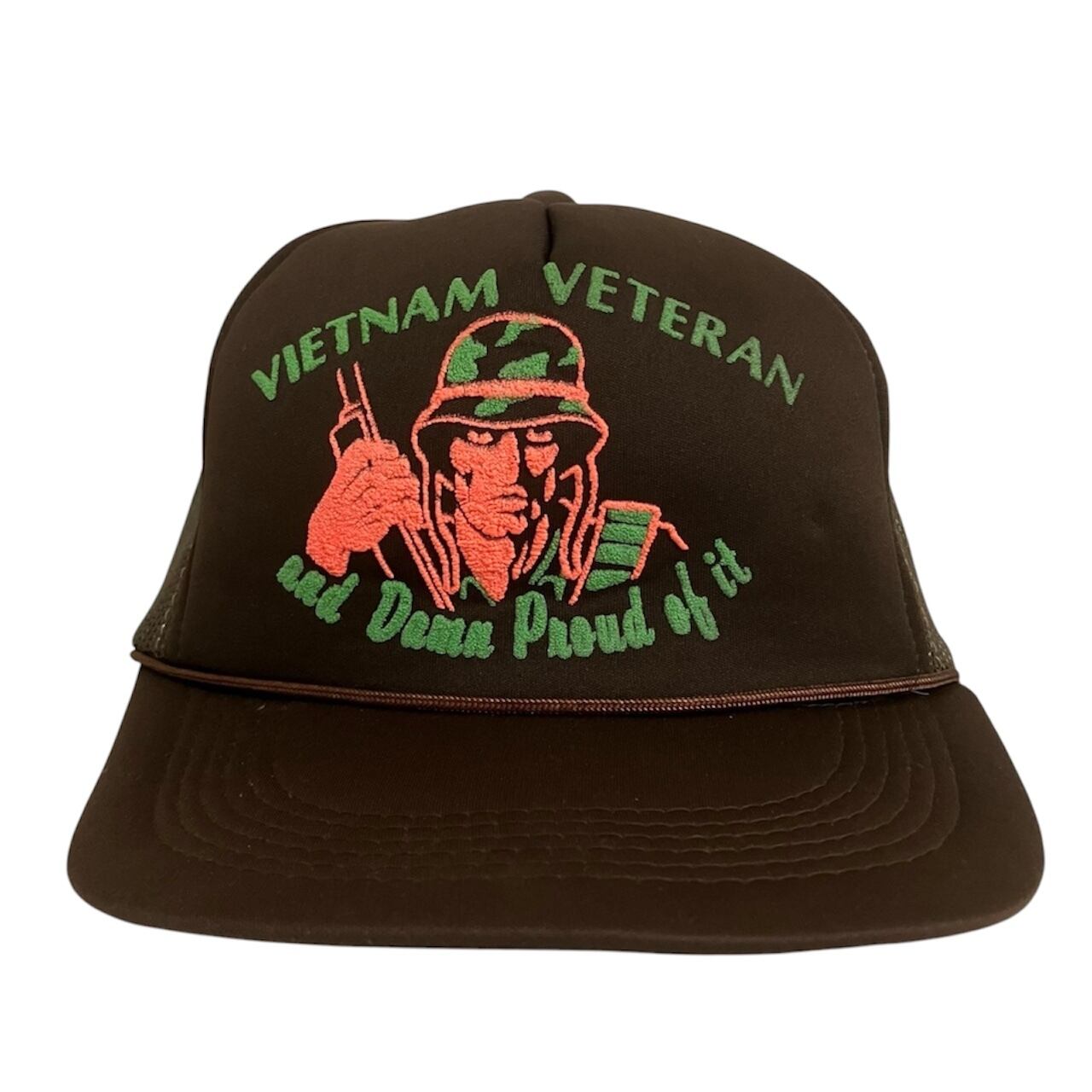1980年代頃のものと見える、ベトナム戦争退役軍人が描かれたトラッカーキャップです。