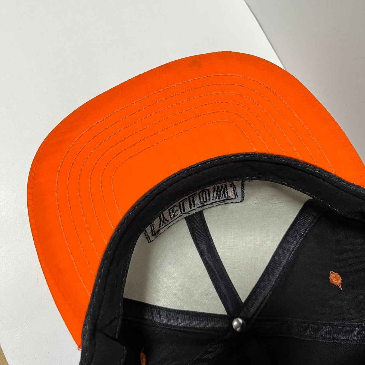 王道のカラーリングと言える存在感あふれる黒とオレンジの2トーンボディに、シンプルなボックス型のロゴが刺繍された一点。