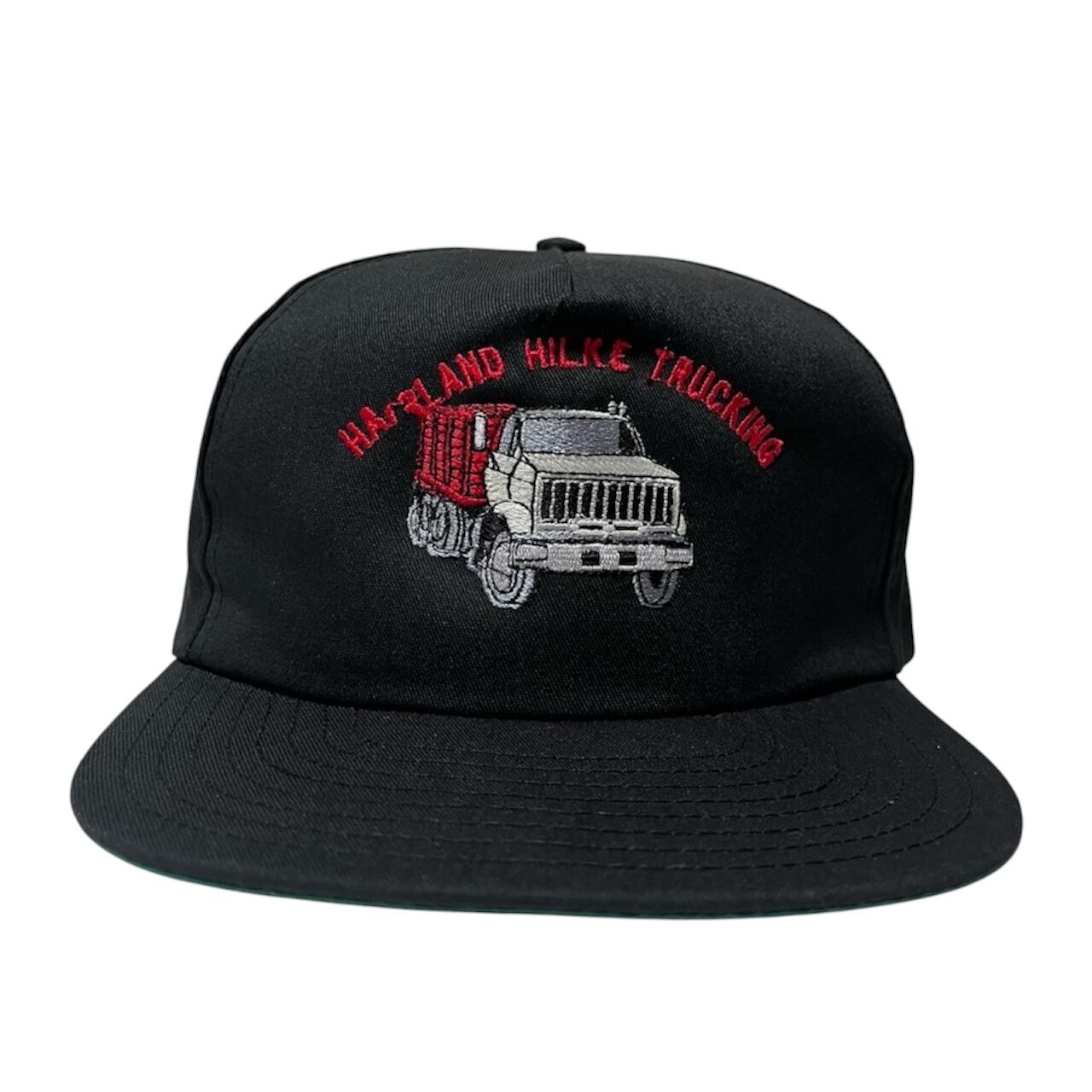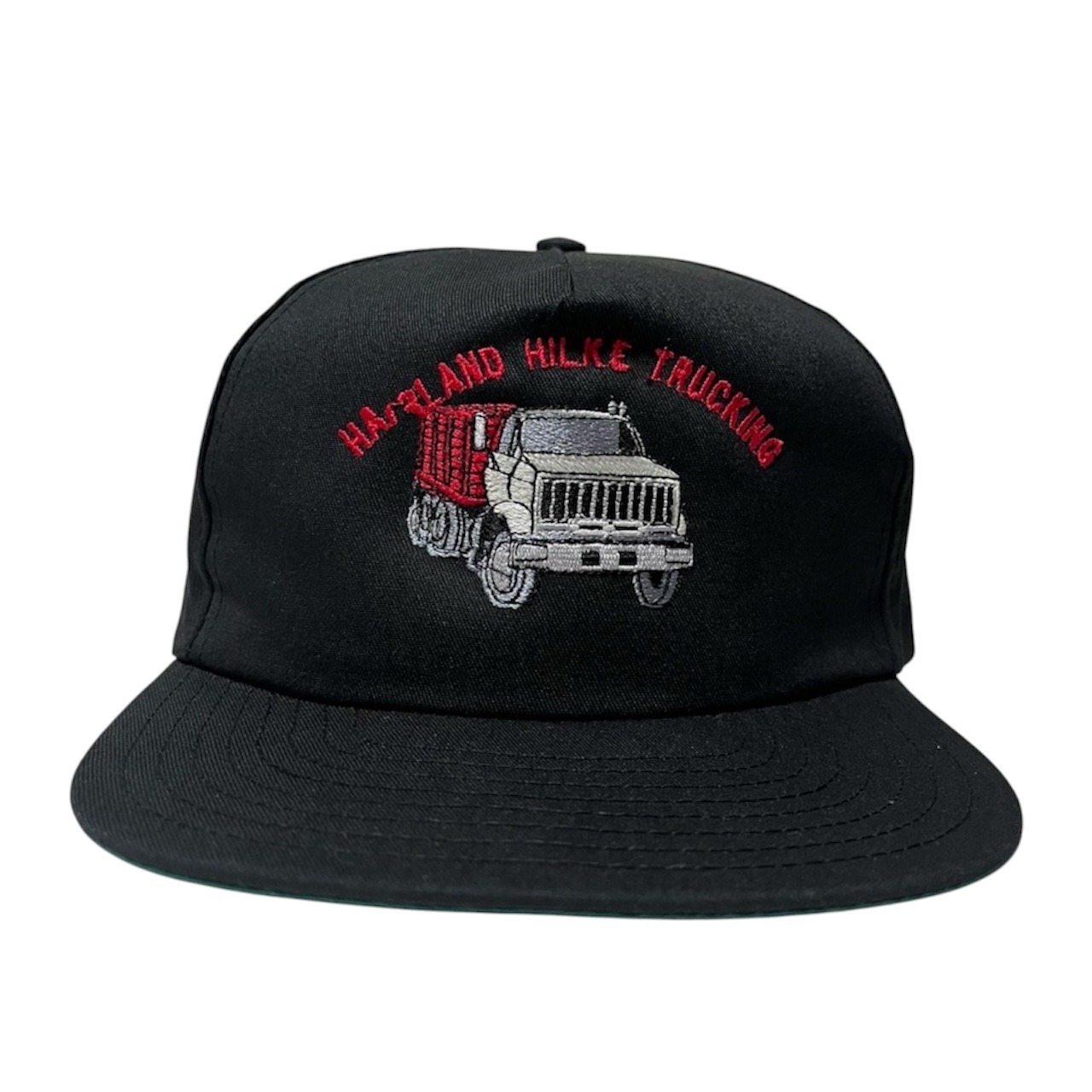 運輸系企業の販促品と見えるこちらは、フロントパネルにトラックと企業名が刺繍されたトラッカーキャップど真ん中の仕上がり。