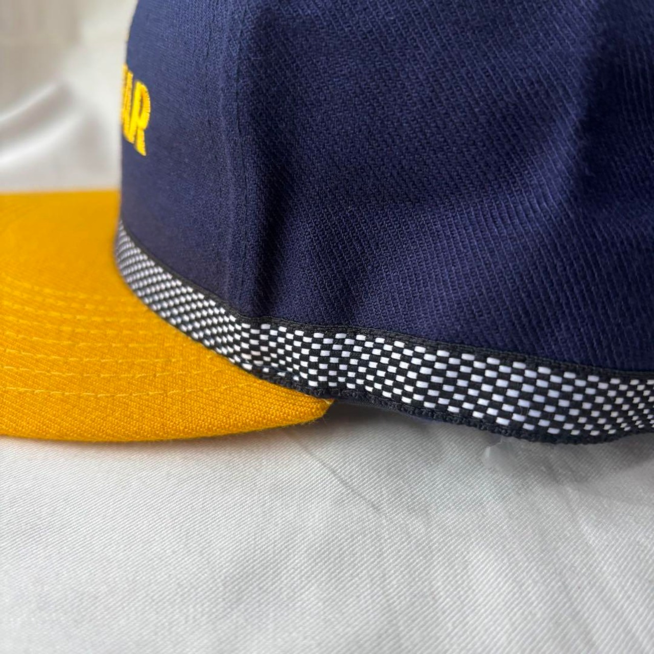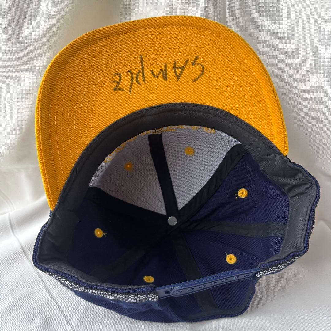 ネイビーボディに黄色のバイザーと刺繍の2トーンに加え、ボディ下部に施されたチェッカーテープの存在感が際立ちます。