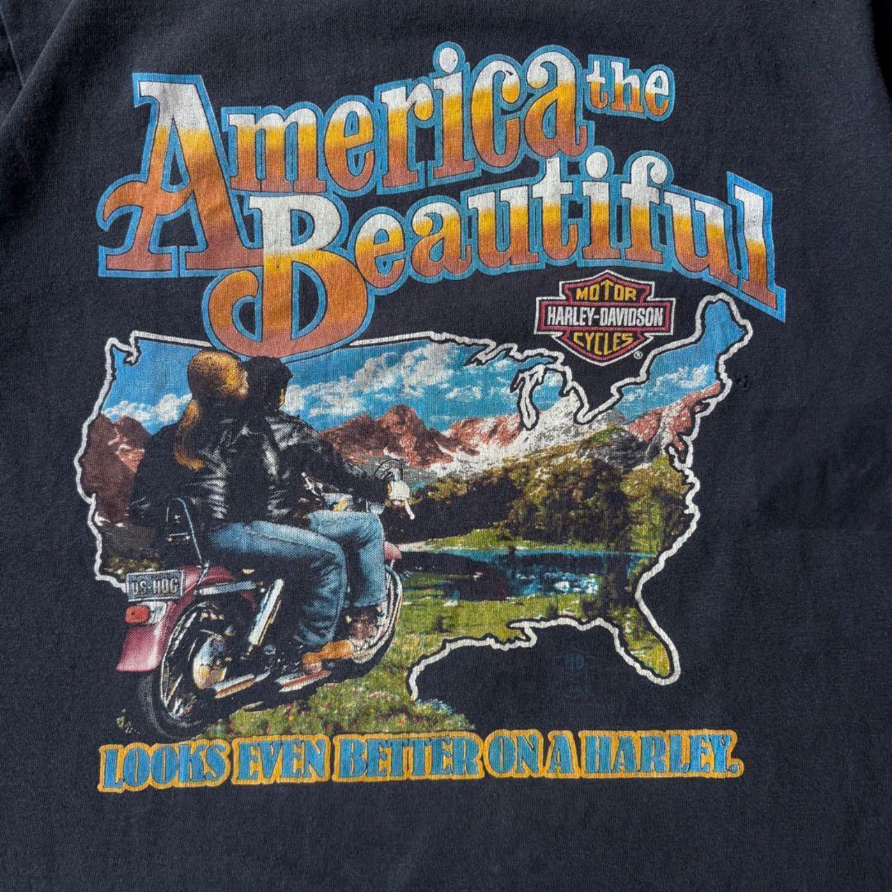 ネバダ州レノのディーラーアイテムと見えるこちらは、フロントにはアメリカの国土の中に描かれた美しい自然とタンデムをするバイカーのグラフィック、バックにはイーグルとディーラー名がプリントされた存在感ある一枚。