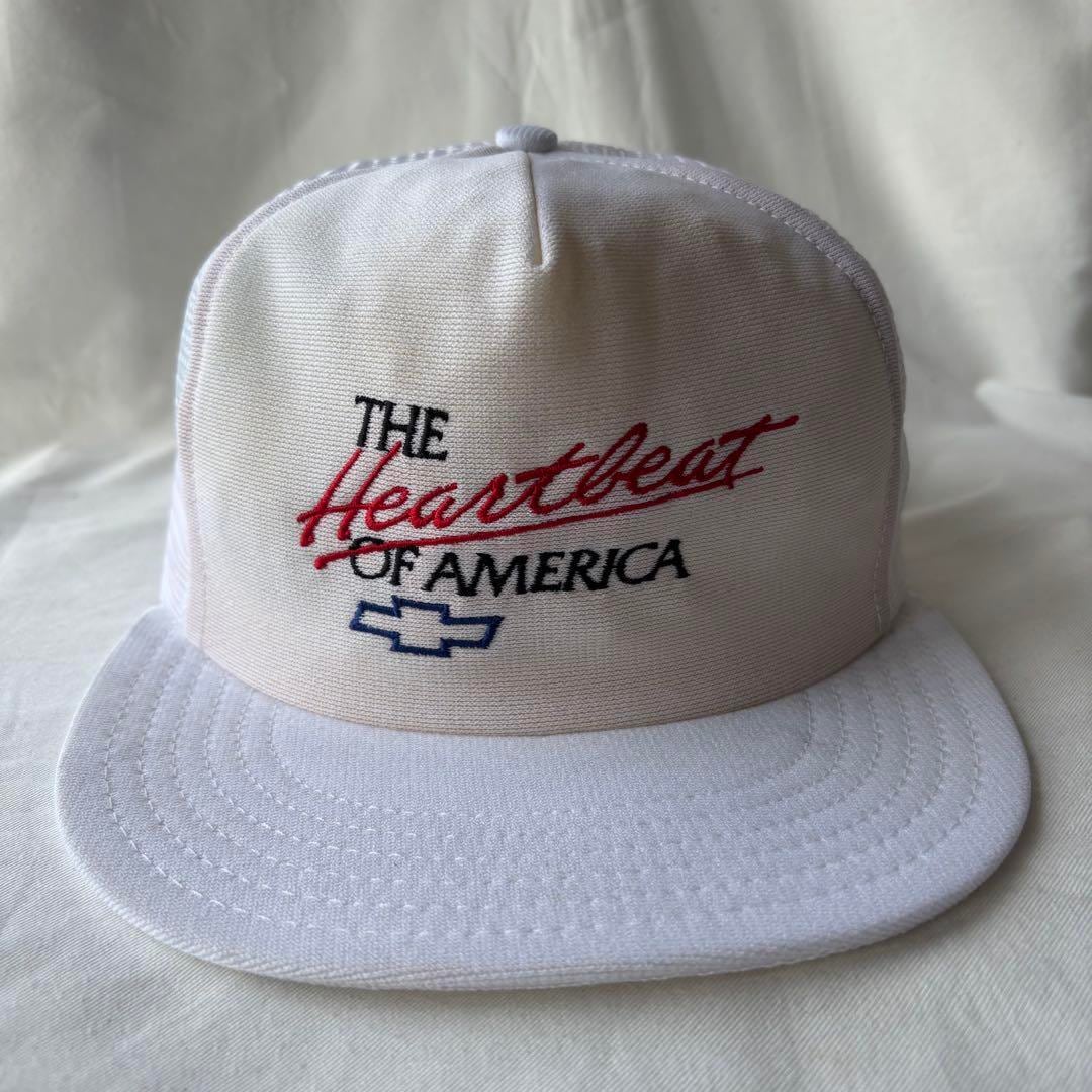 フロントにはシボレーの代表的なフレーズである”The Heatbeat of America”、力強いエンジン音が特徴であるシボレーの音こそアメリカの鼓動、というスローガンとボウタイロゴが刺繍された存在感のある仕上がり。白色ボディが爽やかな一点です。