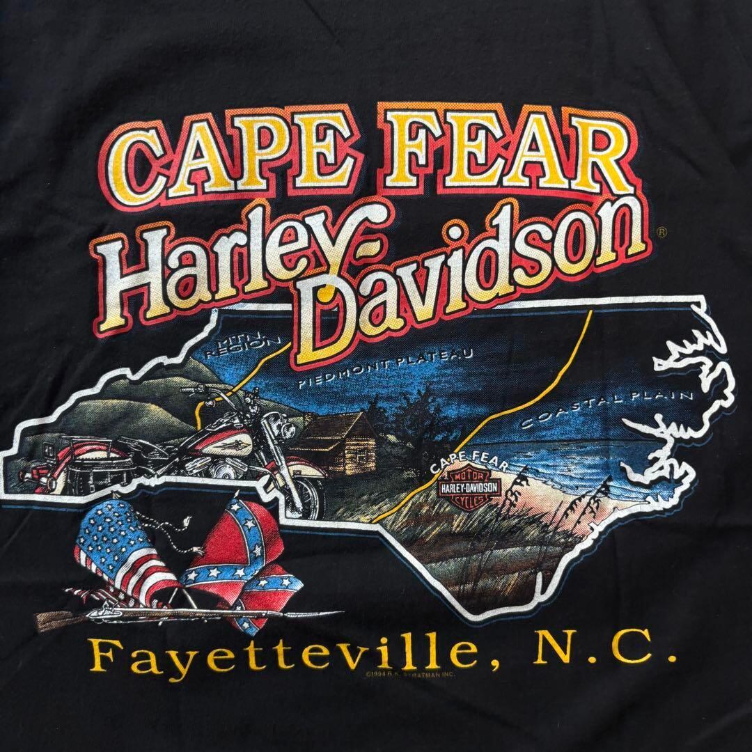 ノースキャロライナ州のディーラーアイテムと見えるこちらは、フロントの”REAL MEN DON’T NEED DIRECTION”/(本物の男には方角はいらない)、と言う我が道を進むハーレーと漢の世界観が込められたフレーズが実にハーレーらしいプリントが魅力的。
