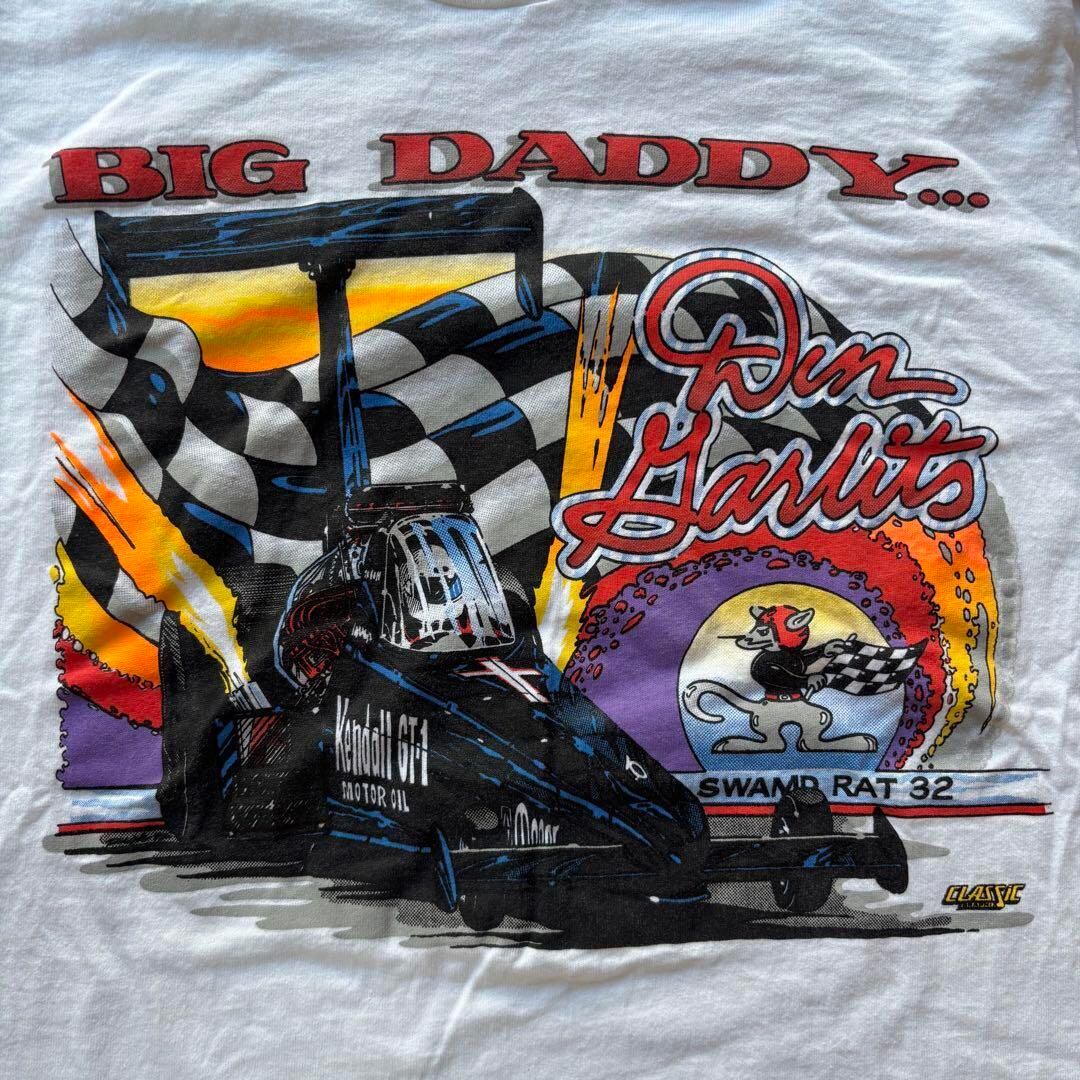 プリントされる”Don Garlits”はドラッグレース、とりわけグラフィックに用いられるトップフューエルクラスにおいての伝説的エンジニア。