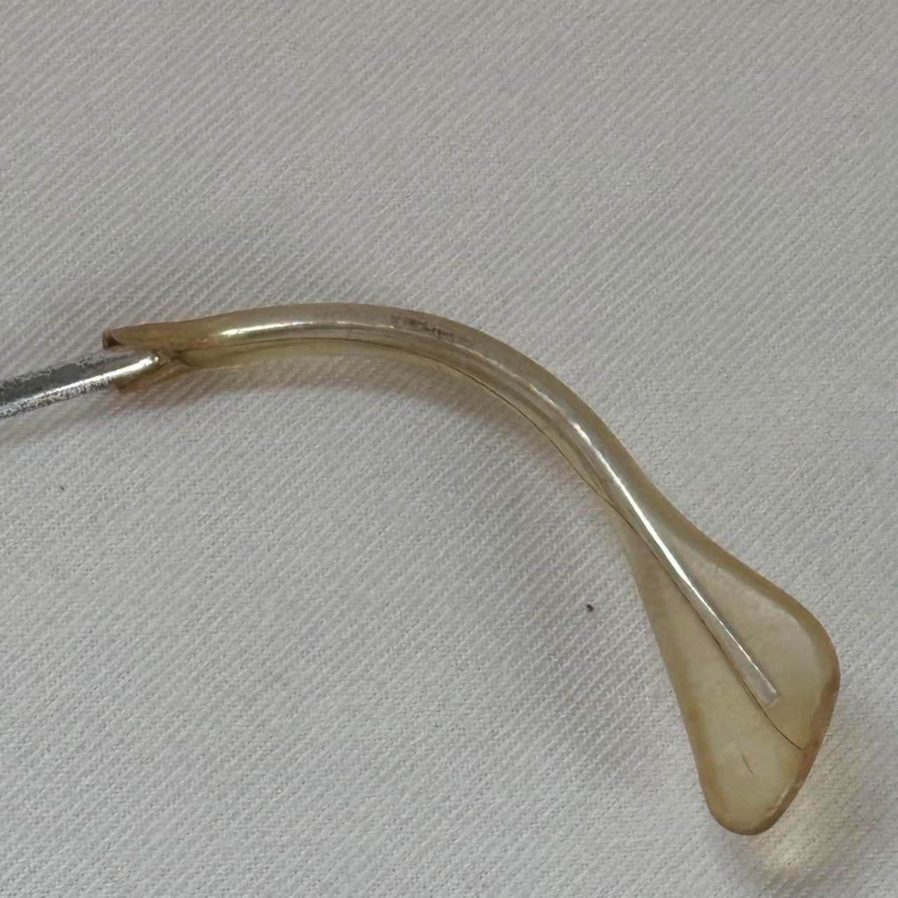 各部年代なりの小傷やヤレ、またテンプルエンドに施されたカバーの劣化が見え、装着部根元のカケが見えます。