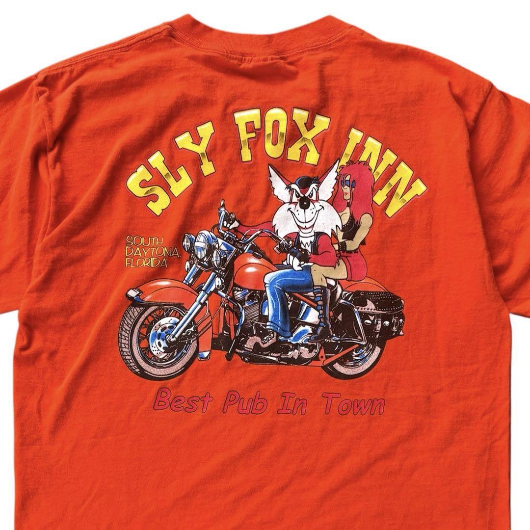 バイカー御用達のバーと見え、背面には店名にちなんだ狐が女の子を乗せバイクに跨るグラフィックが描かれています。