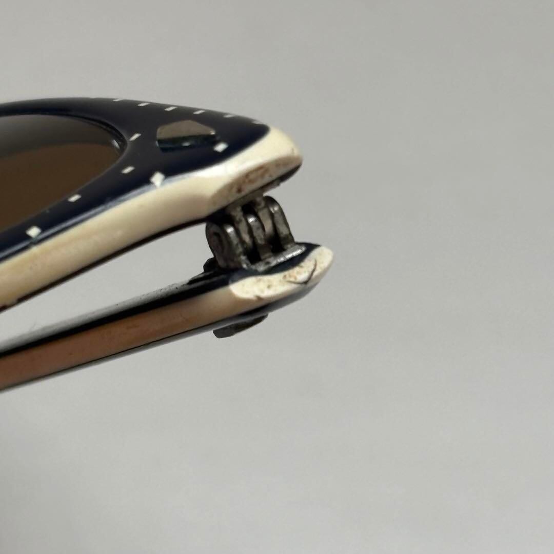 各部年代なりの小傷、クリーム色箇所の変色とテンプル根元の僅かなチップが見えます。