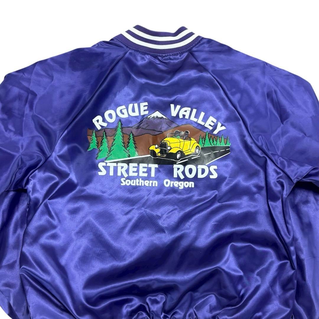 オレゴン州のカークラブのチームジャケットと見え、自然の中を走るホットロッドが地域性を映し出した雰囲気のある仕上がり。