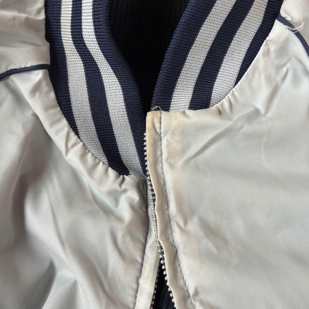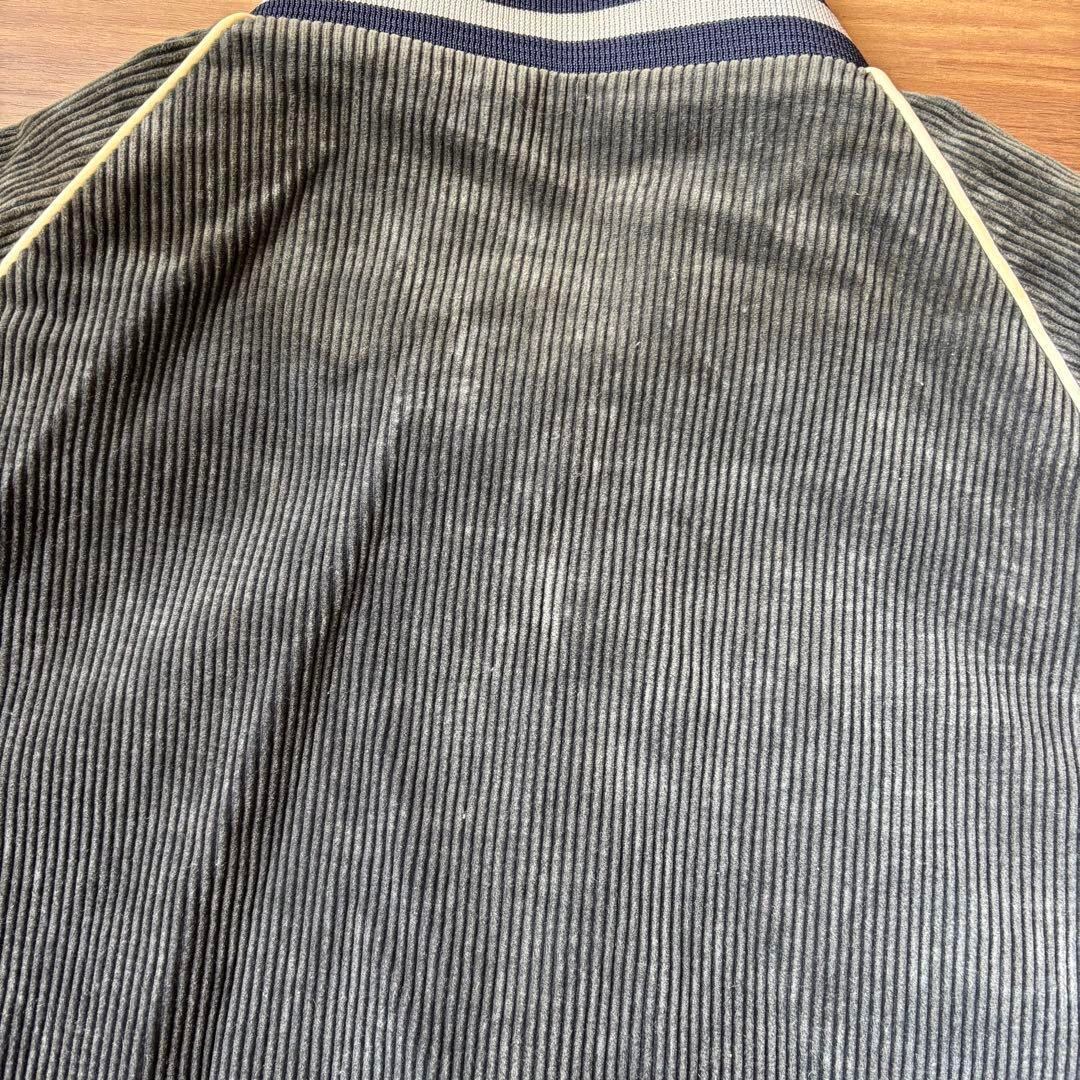 コーデュロイによく見える褪色、ナイロン面の首周りの変色、また小さなシミと裾リブの毛羽立ちが見えます。