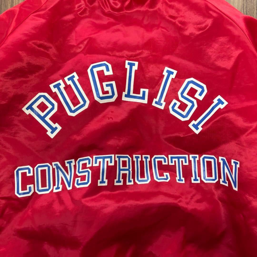 建築系企業のユニフォームと見えるこちらは、赤を基調にカレッジ調のプリントが雰囲気抜群。
