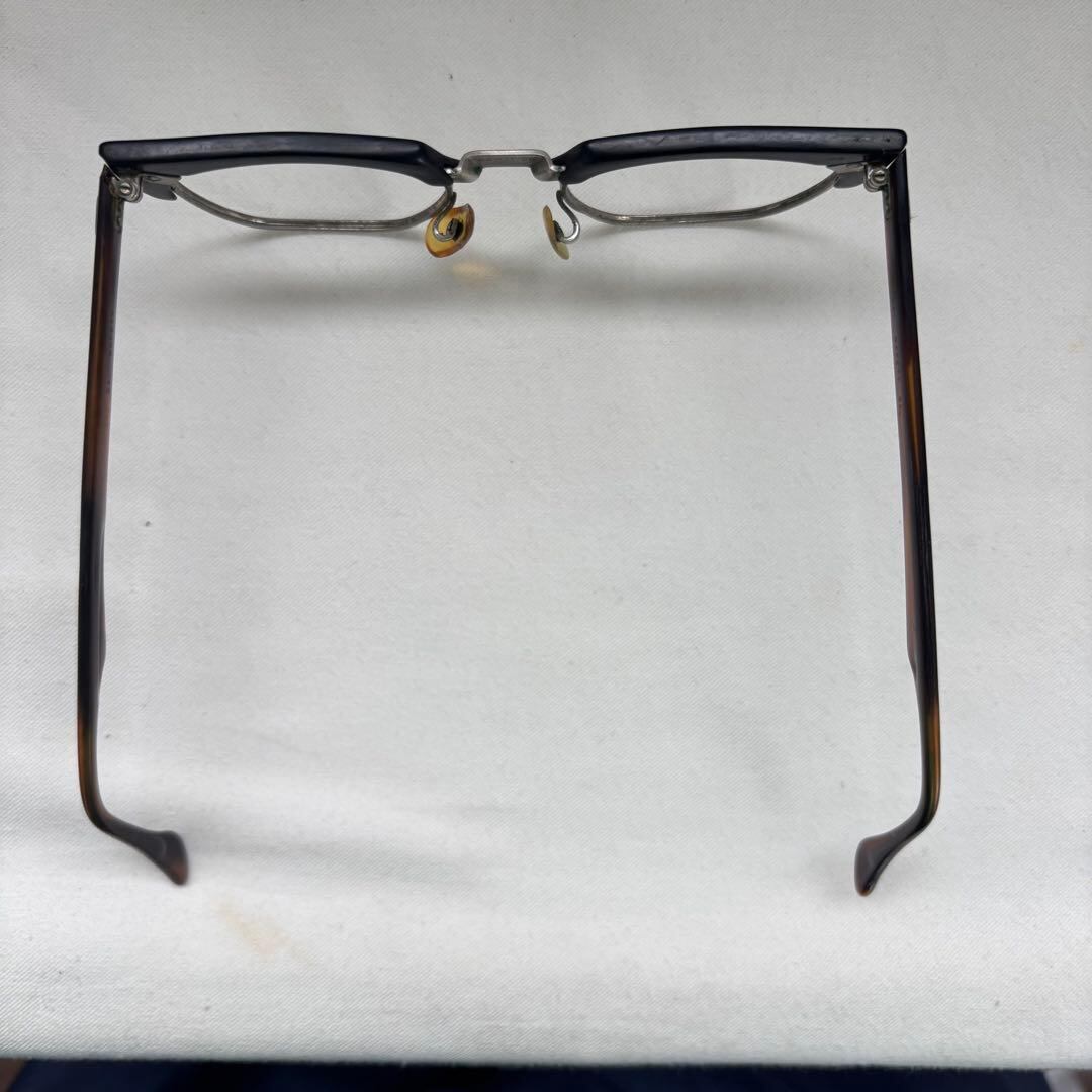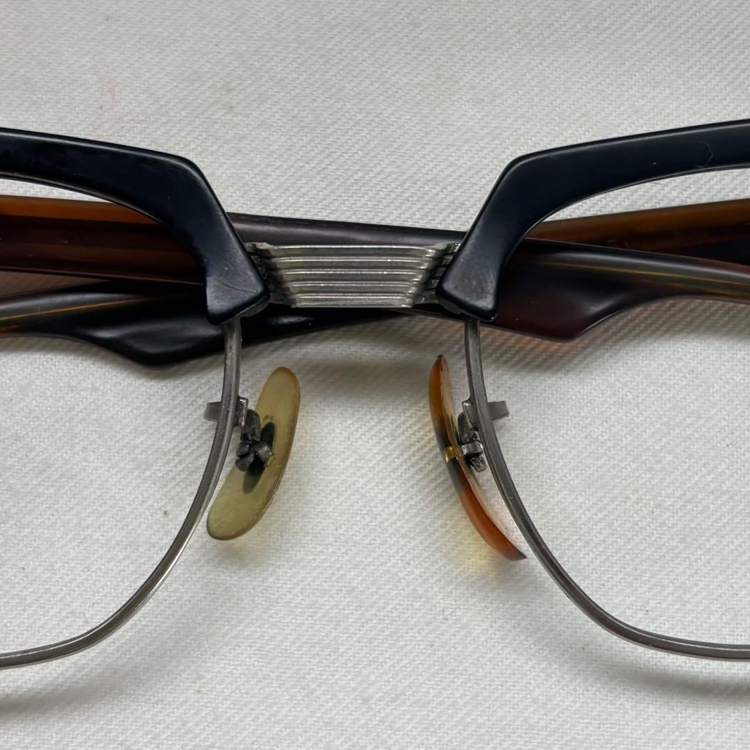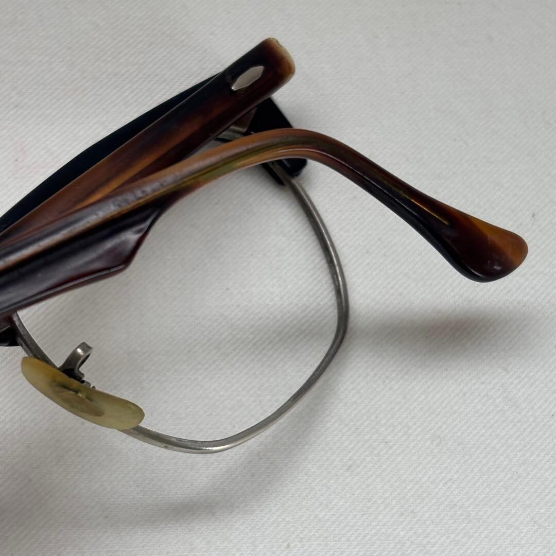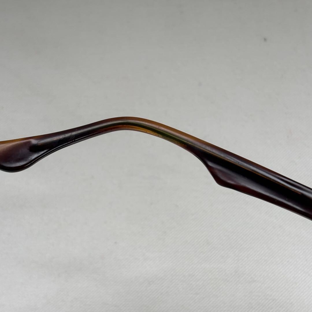 各部年代なりの小傷やスレ、テンプルの劣化や根元のチップ、芯材の緑青、ブリッジ付近のセルの収縮、左右のノーズパッドの違いや劣化等が見えます。