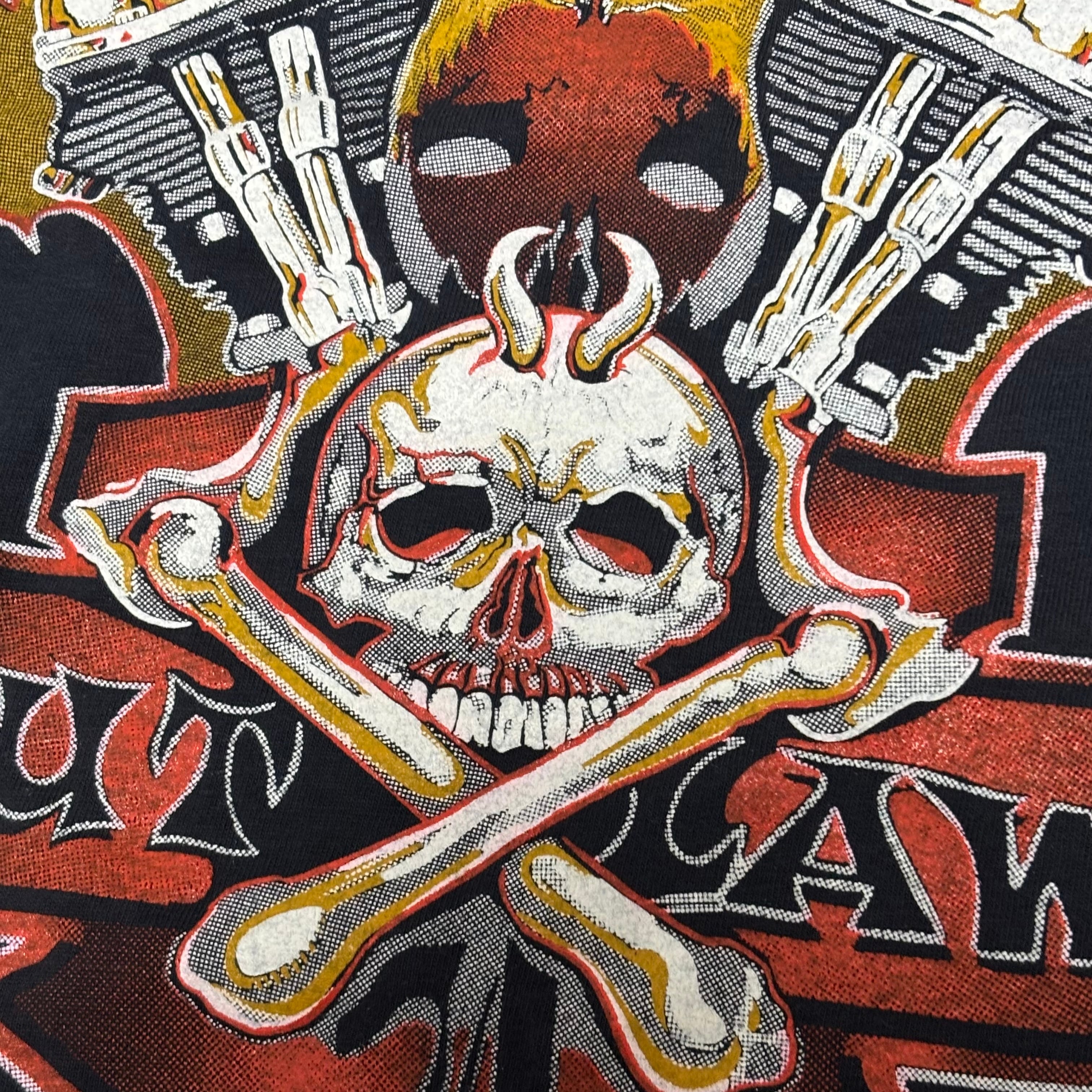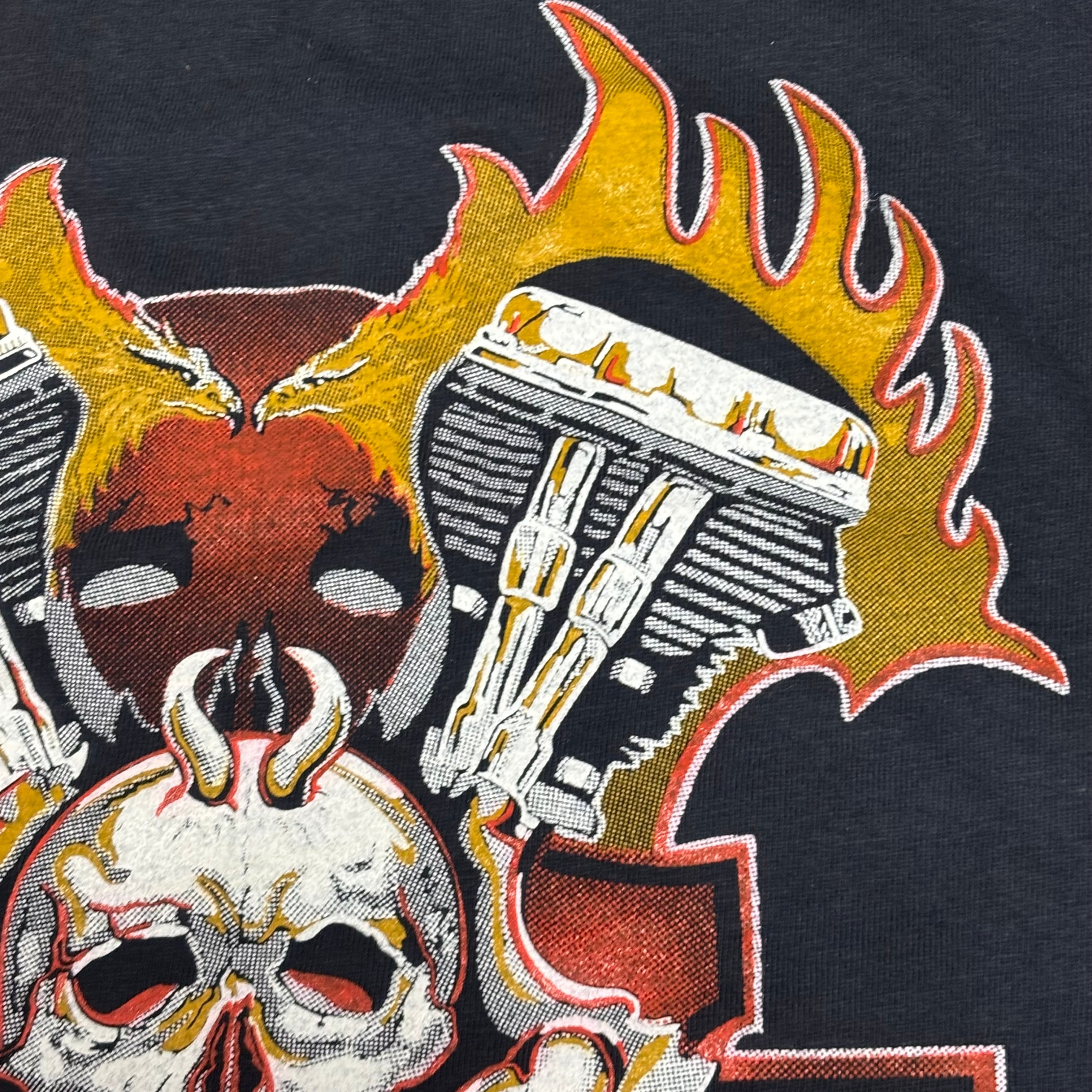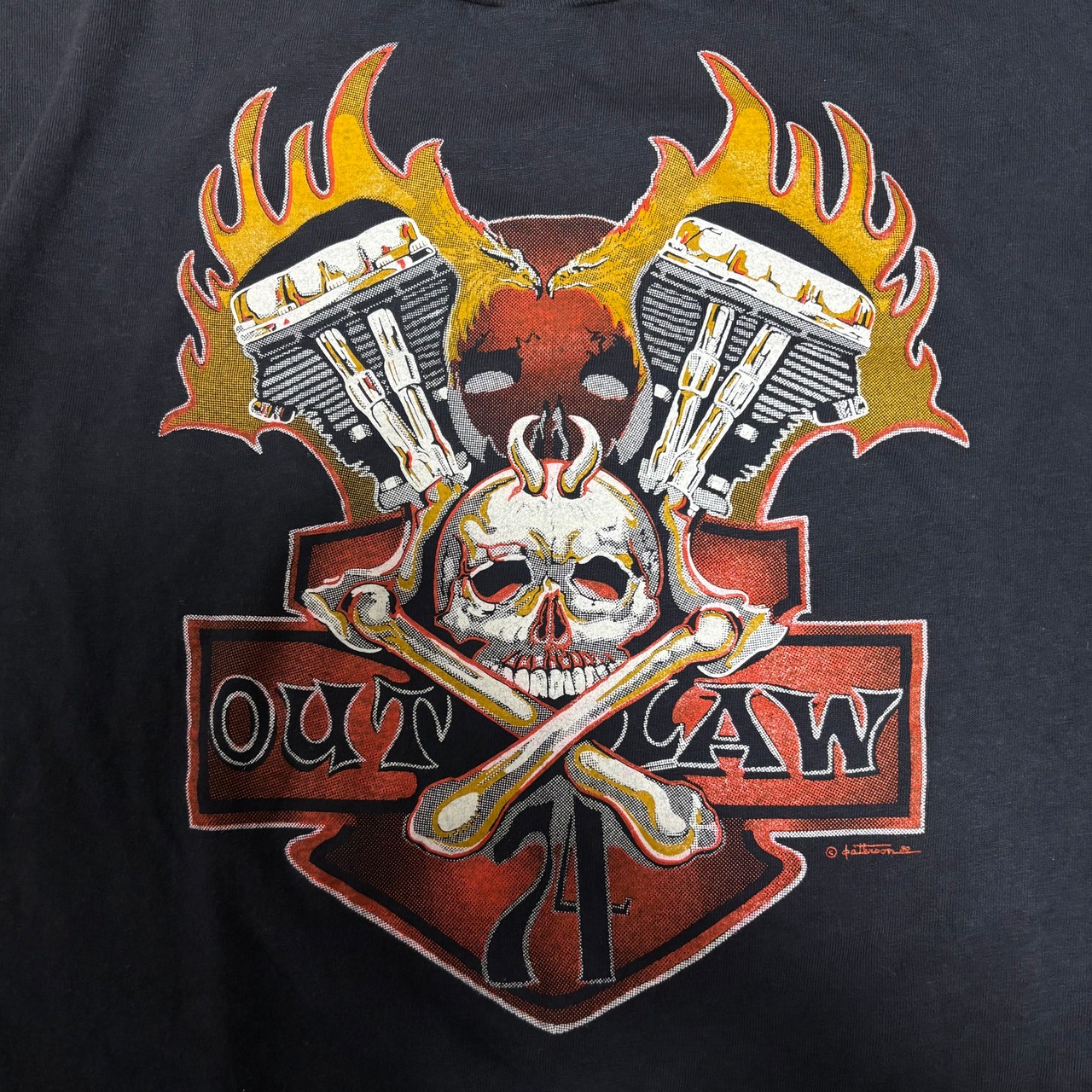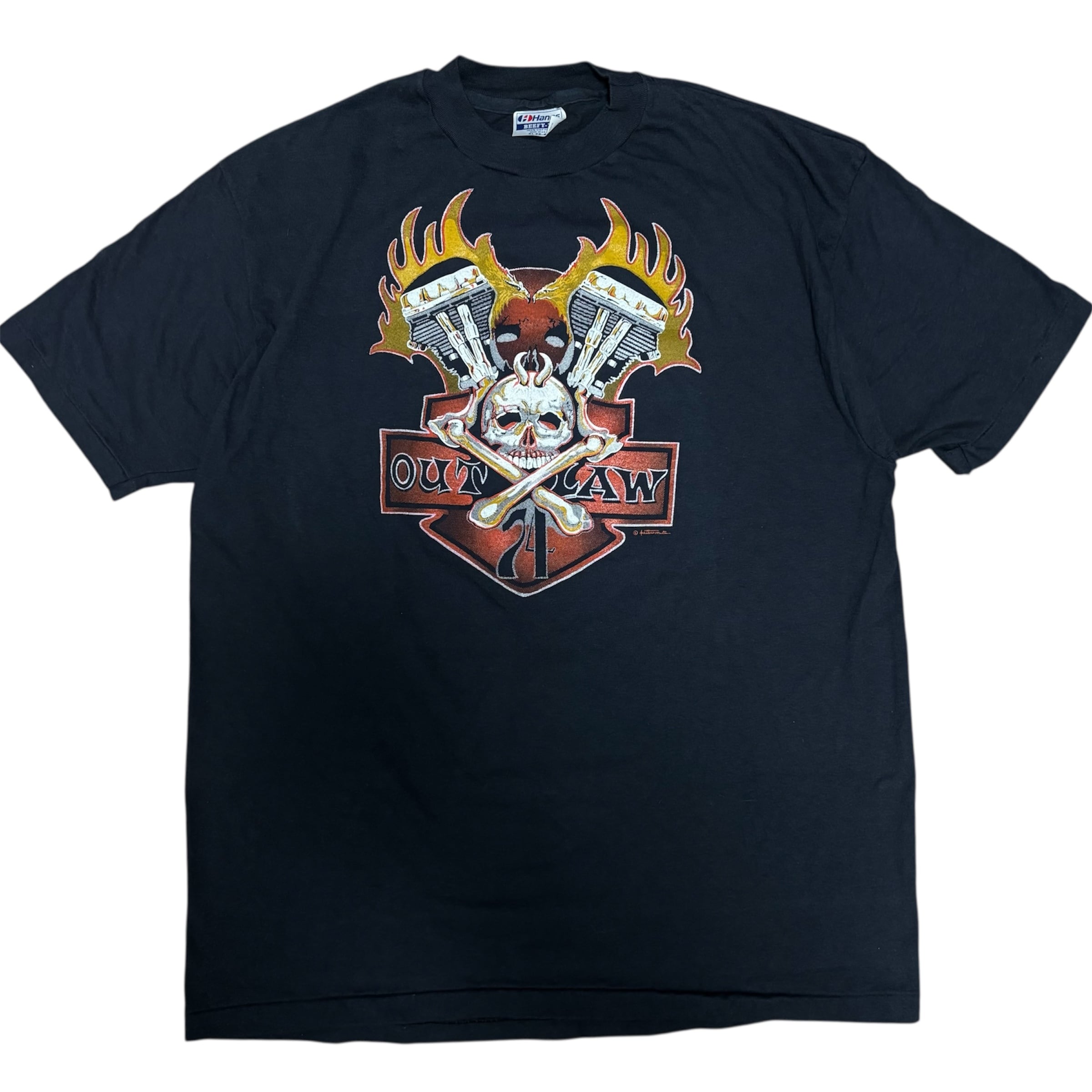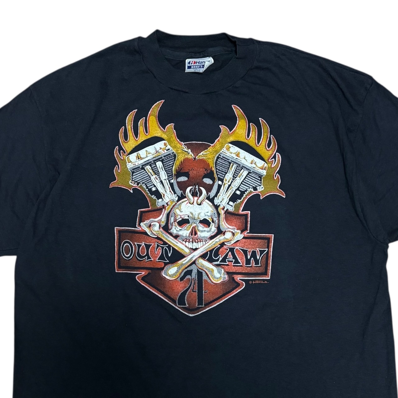 フロントにはバイカーTシャツにおいて非常に希少なプリントが施されており、パンヘッドとB&Sを背景に、角を有する悪魔のスカル、74とOUTLAWのフレーズと、まさにバイカーTのど真ん中と言えるアウトロー感溢れる抜群のグラフィック。