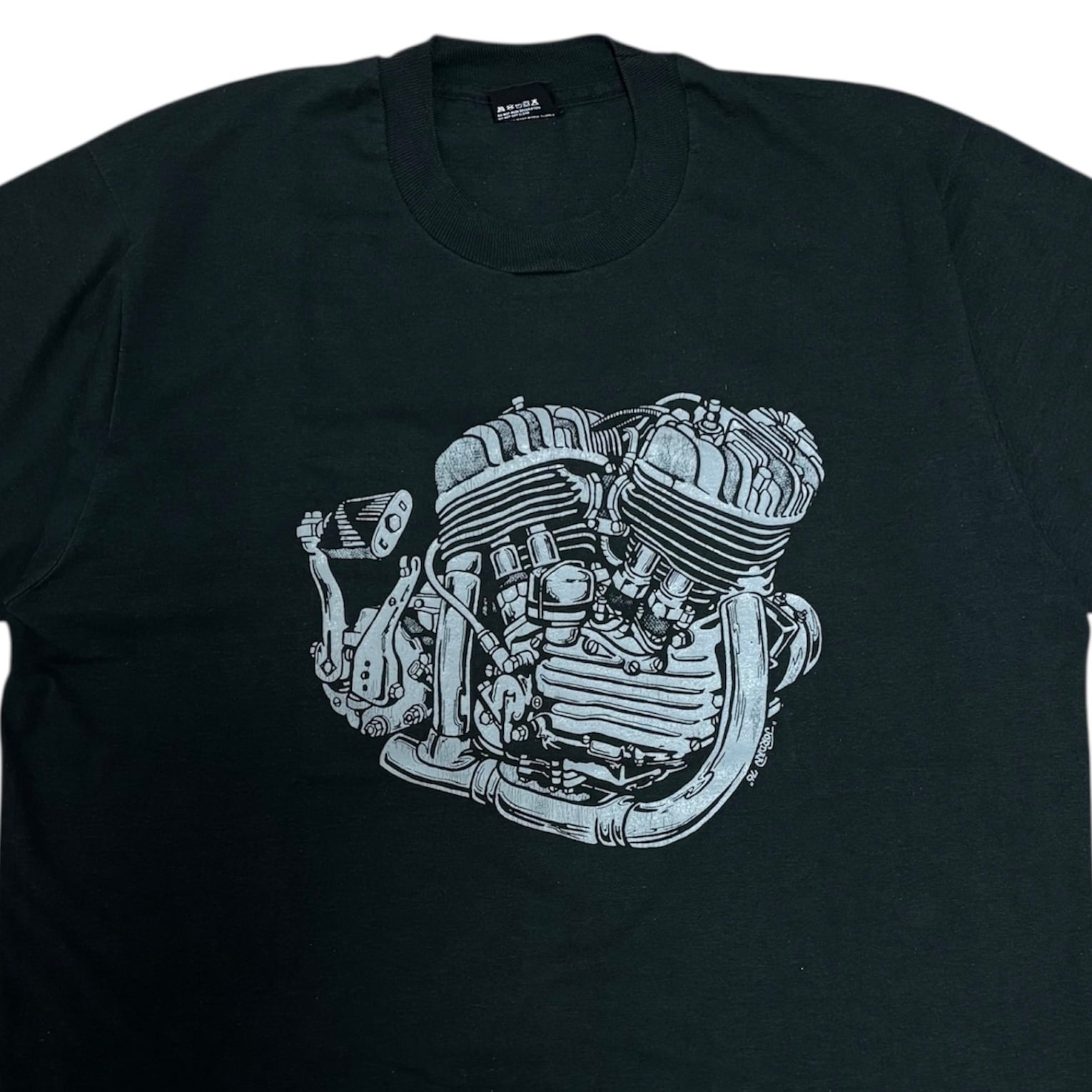 フロントには彼の作風としてはレアなサイドバルブのプリント、背面には様々なイベントで用いられる彼がデザインしたイーグルのプリントが施された、ジョンジョーダン色が全面に出た一枚。