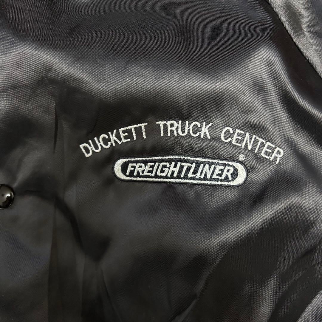 運輸系企業のユニフォームと見えるこちらは、胸元の刺繍のみのシンプルな刺繍に、各部の白黒のリブが映える仕上がり。