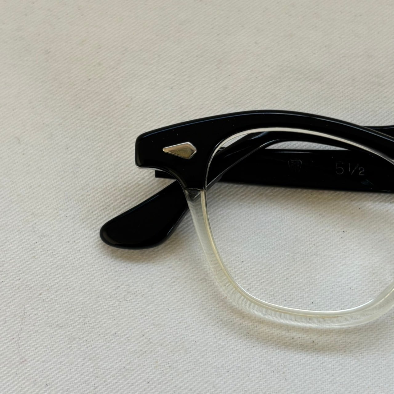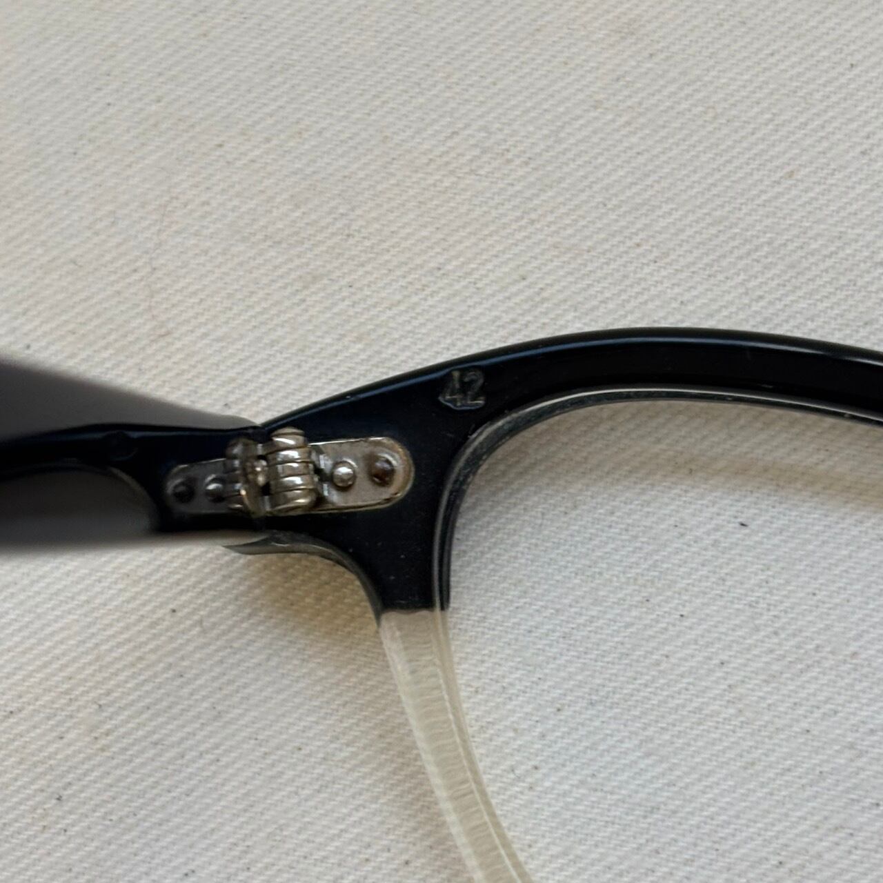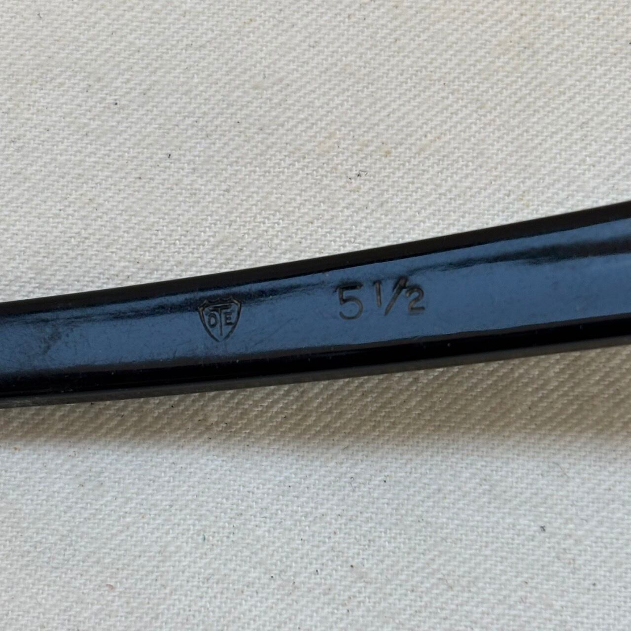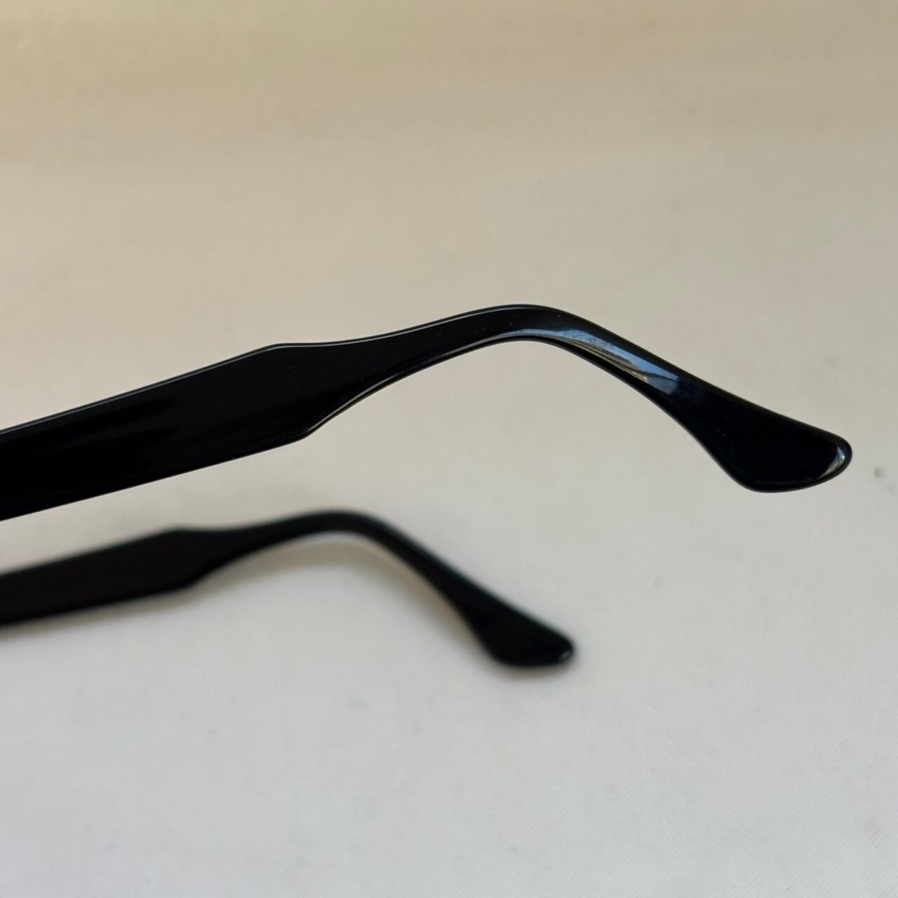 年代なりの小傷やヤレ、左テンプル外側のスレと反り、また元々入っていたレンズ厚によると見えるフレームのやや歪みが見えます。こちらはレンズ装着の際に修正可能な程度と見えます。