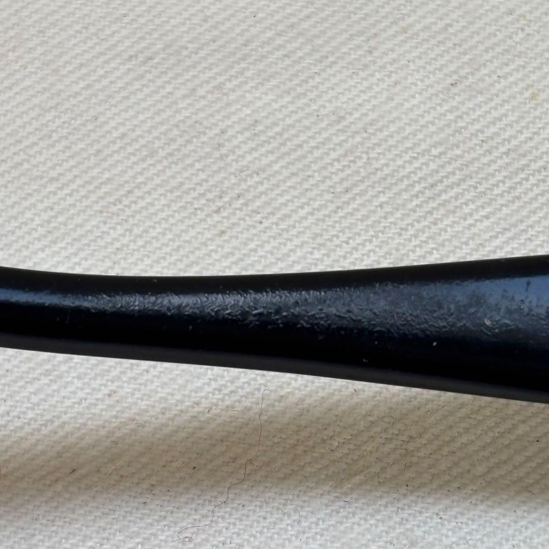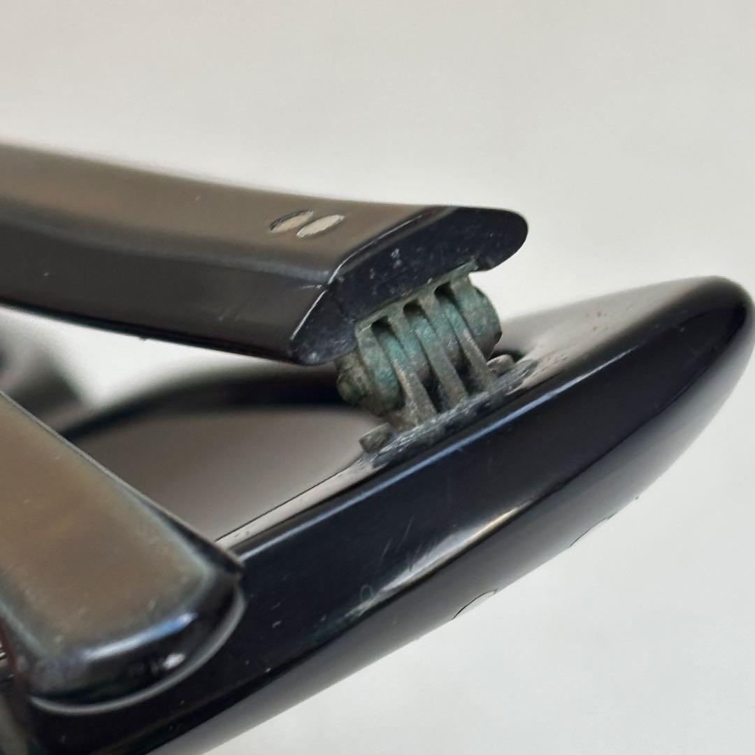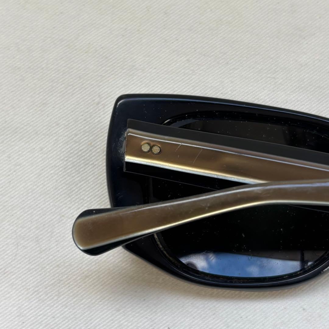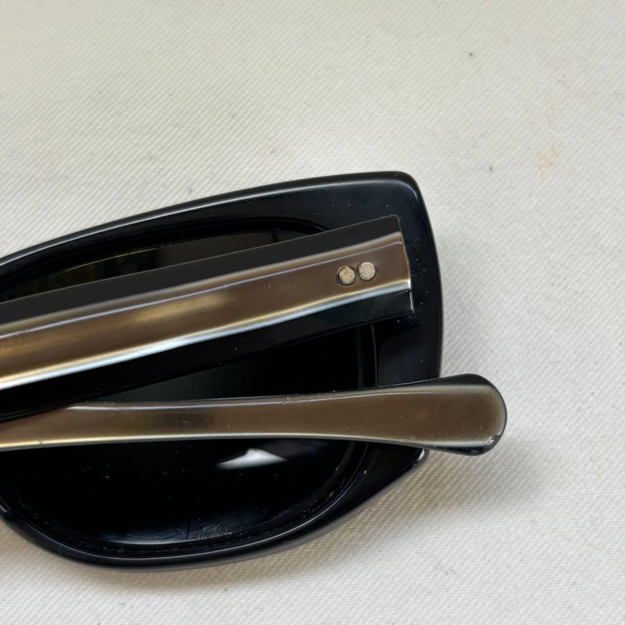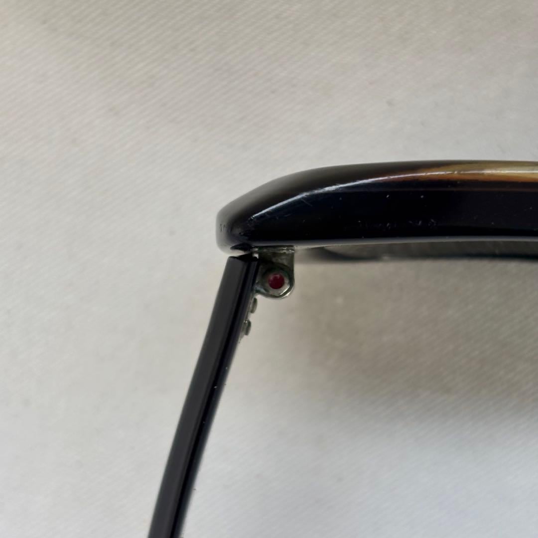 年代なりのヤレと小傷、右テンプル根元の僅かなクラック、左テンプル内側のスレ、蝶番の緑青等が見えますが、着用可能な悪く無いコンディションと感じます。