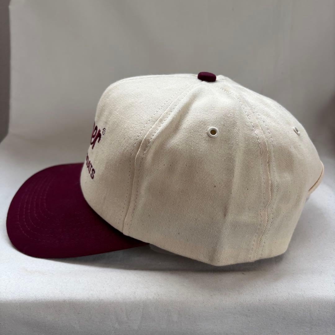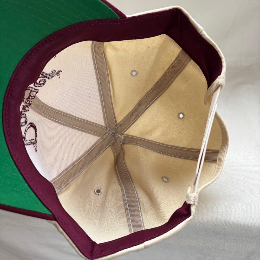 渋みのあるベージュとバーガンディのバイカラーボディにロゴの刺繍が施された存在感ある一点。