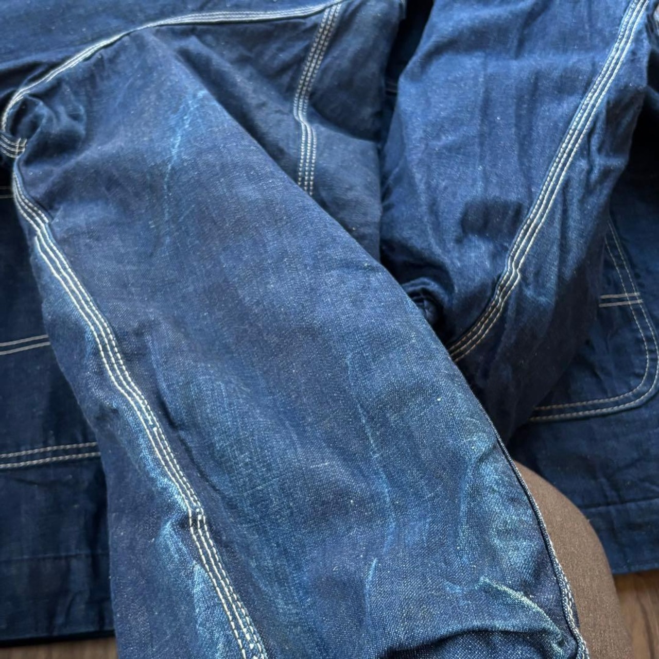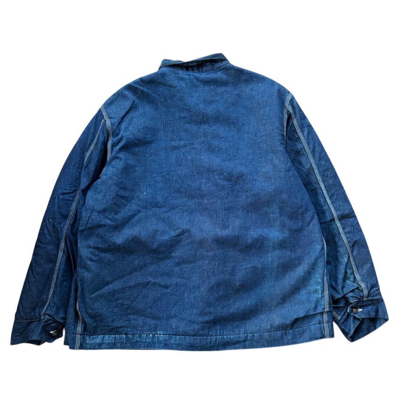 前立て中央、背面の裾付近、左袖等、局部的な色落ちは見えますが、全体の色残りは7~8割程度残っており、また致命的な汚れや破れ等も見えない良好なコンディションと感じます。