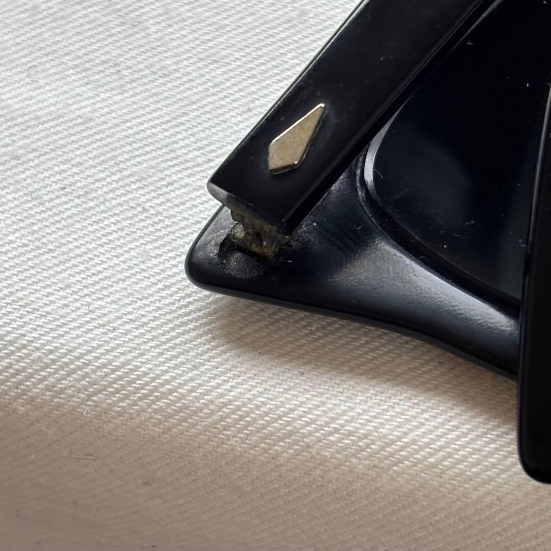 各部年代なりのヤレと小傷、テンプルの傷や両蝶番の付け方の荒さによる穴が見えます。