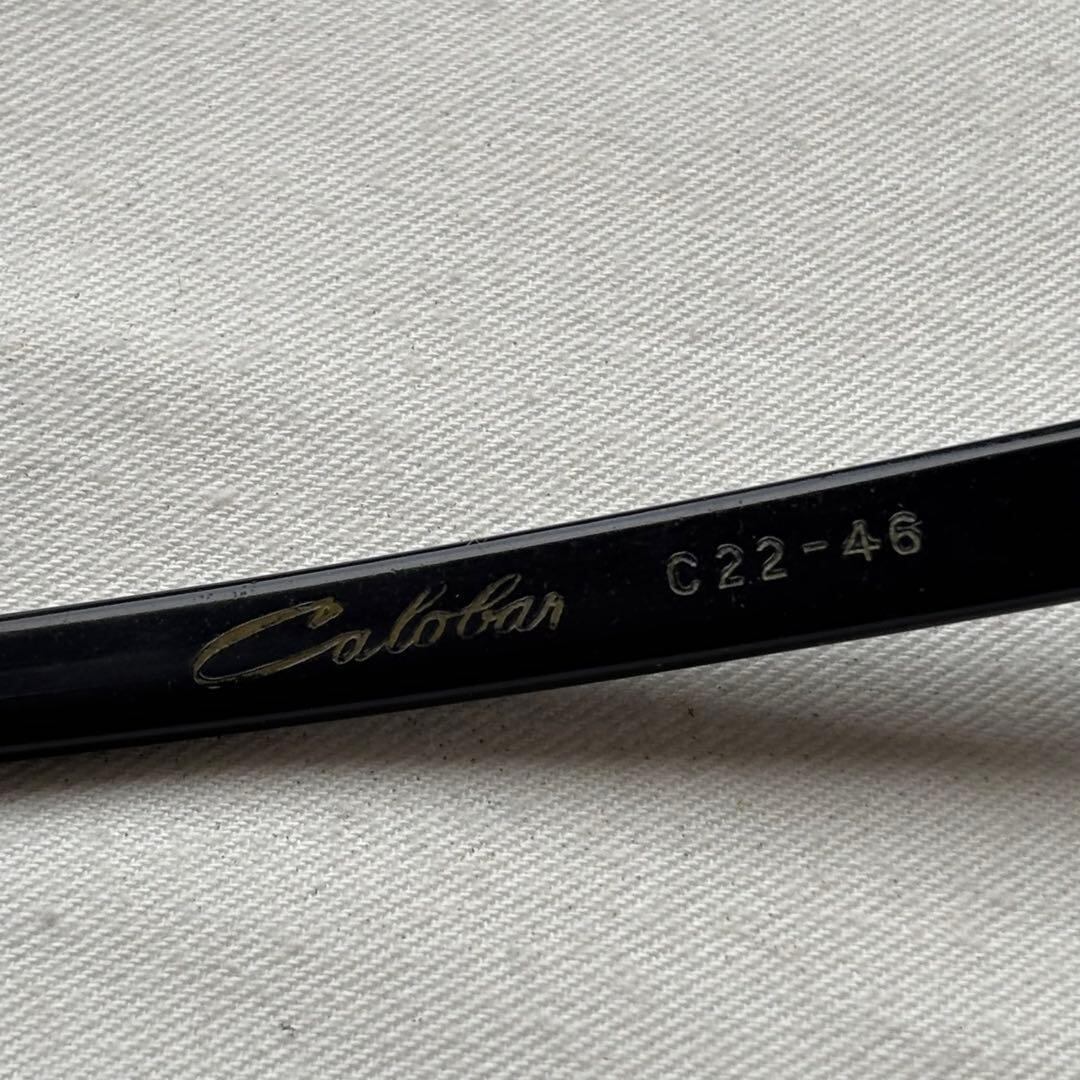 レンズはウェリントンシェイプながらも、フレームエンドにかけて吊り上がりを見せるフォックス~キャッツアイ系のシルエット。右テンプルにはAOのレンズナインナップの”CALOBAR”の刻印が施されており、リベットには同社の人気モデルであるSTADIUM等でも用いられるダイヤ型のリベットが使用されています。