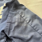各部年代なりの着用感、ヤレ、褪色、汚れ、シミ、ステッチのほつれ、また右袖のリペア跡が見えます。