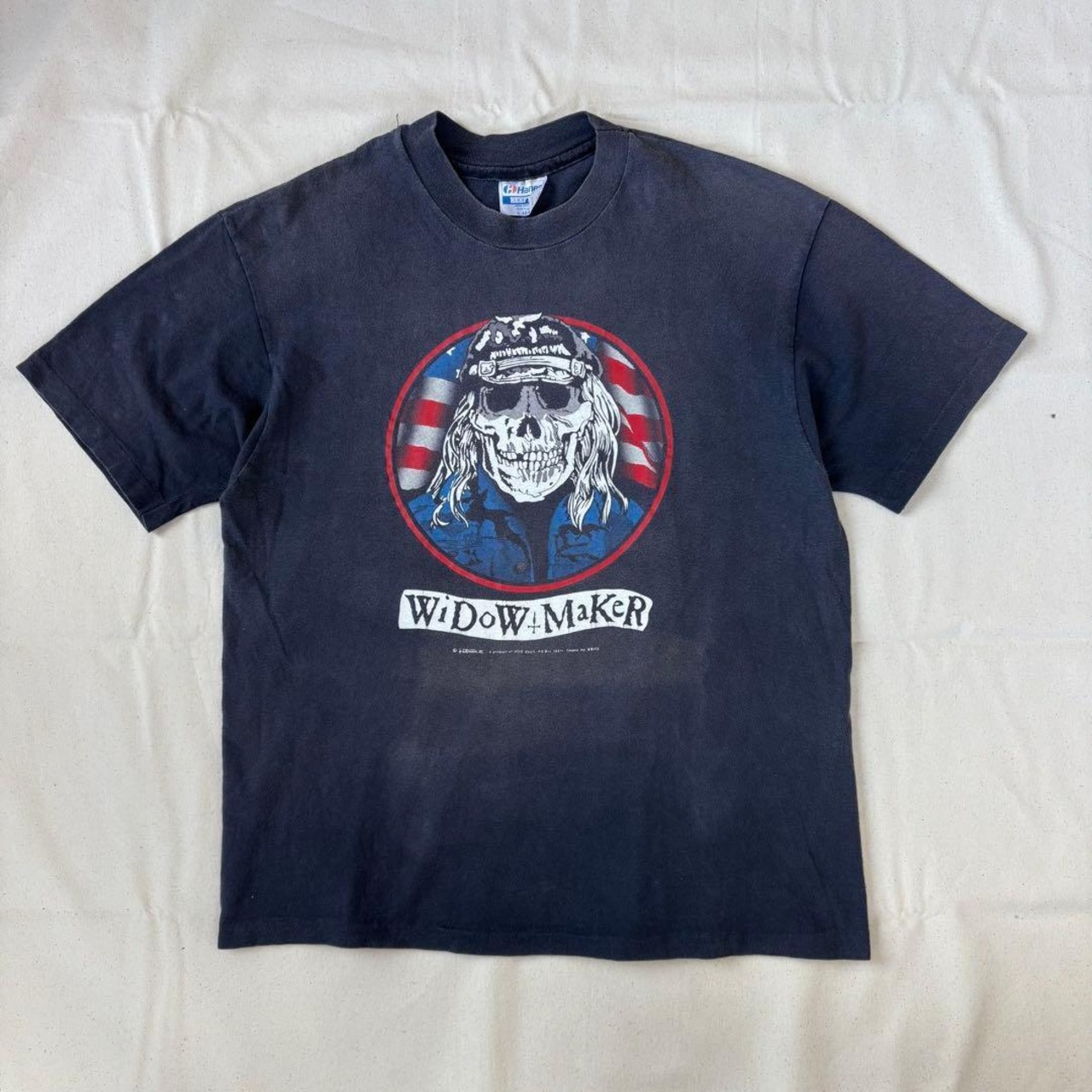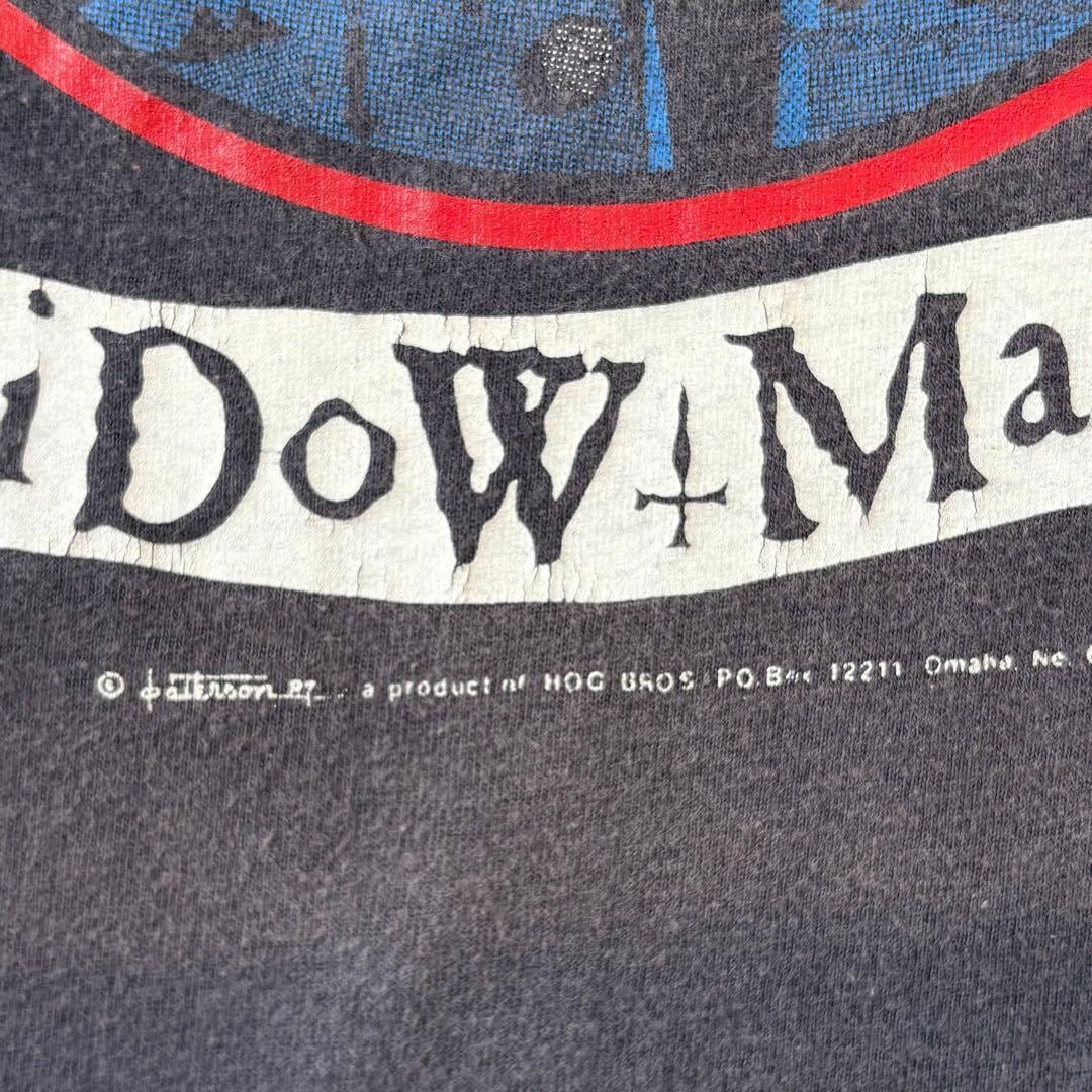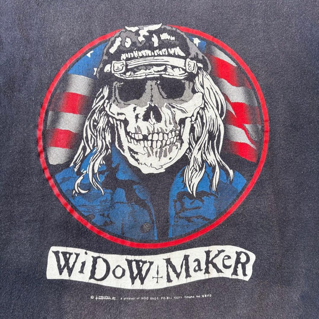 “Widow Maker”(寡婦/未亡人製造機)、即ち危険な乗り物に乗るバイカーを表現するフレーズと共に描かれるスカルのデザインは、往年のバイカーT然りの仕上がり。