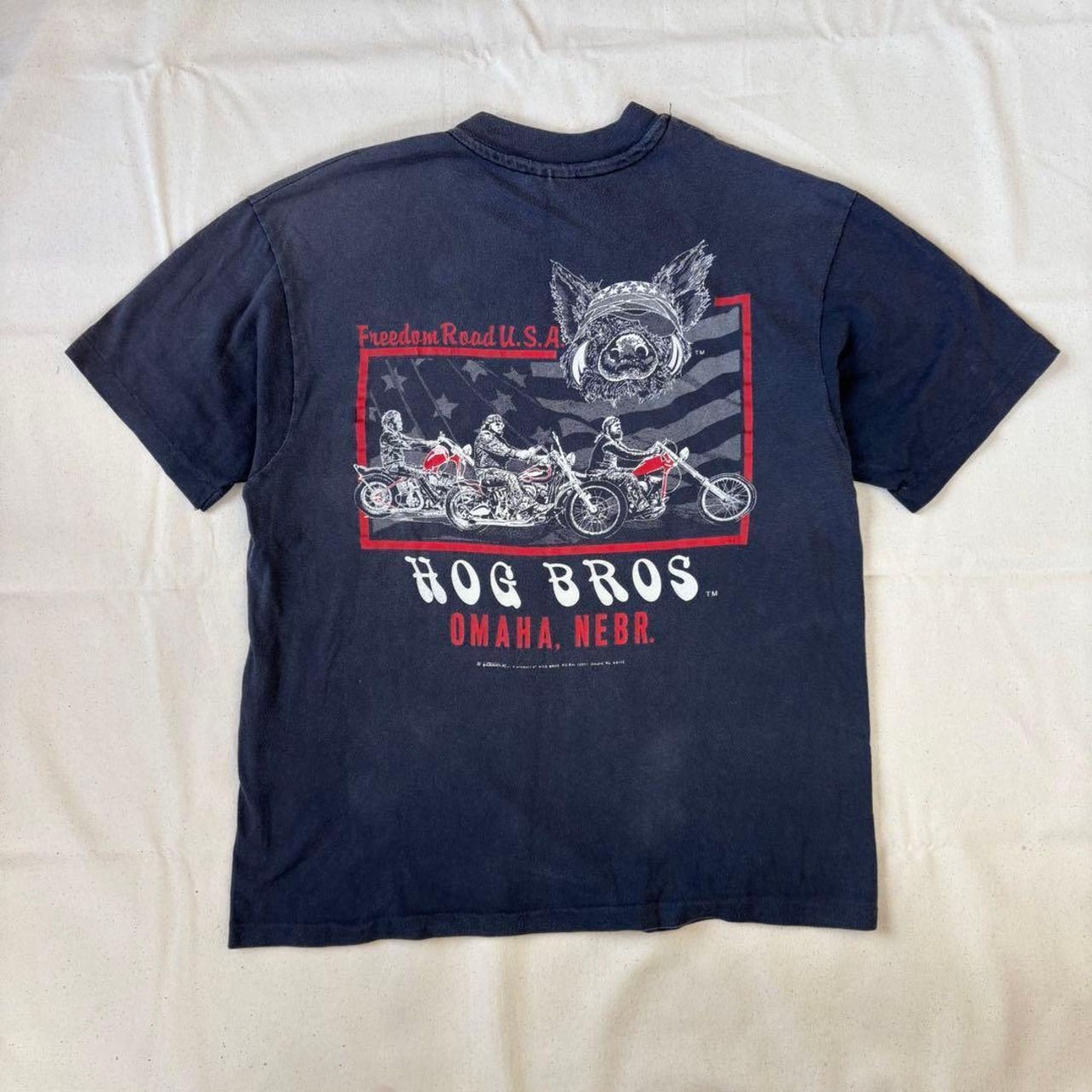 背面にはチョッパーに跨るバイカー達と共にHog/豚が描かれたオリジナルデザインのプリント。