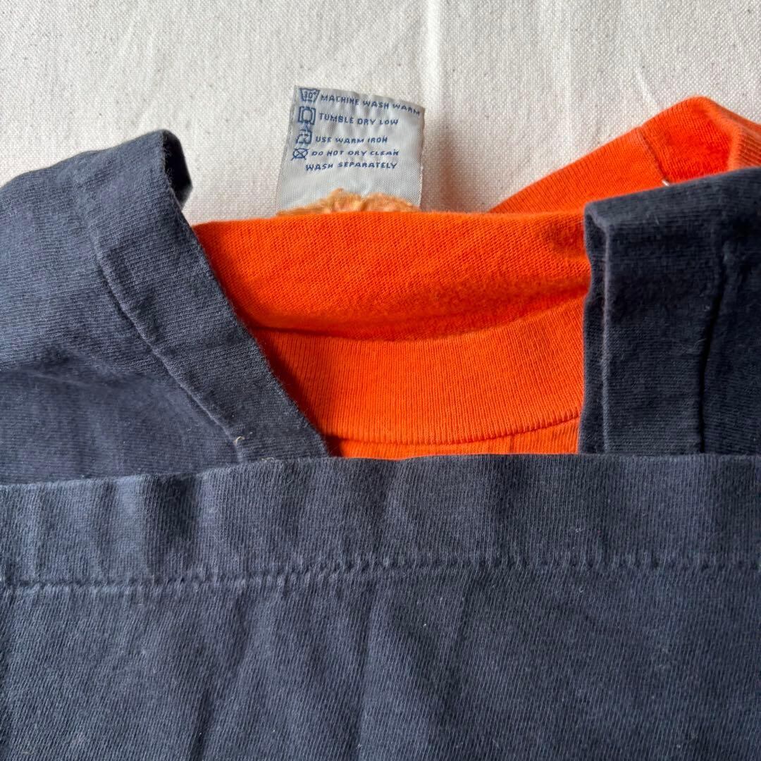 ハーレーを思わせるオレンジと黒のタイダイ染ボディに、フロントにはマフラーやコンロッド、そしてピストンといったパーツ群でイーグルを表現したデザイン、背面にはシンプルにショップの所在地がプリントされた雰囲気の良い一点。