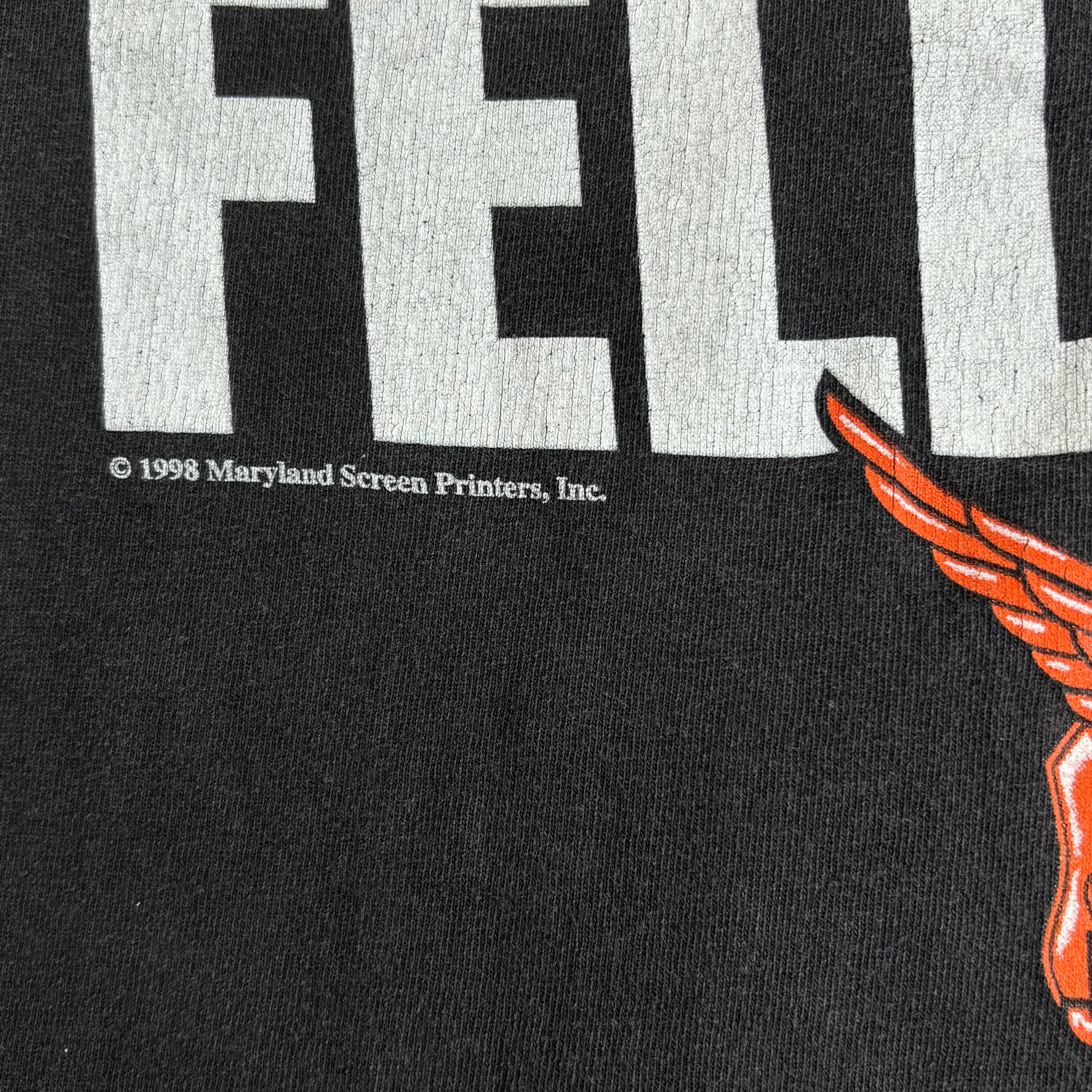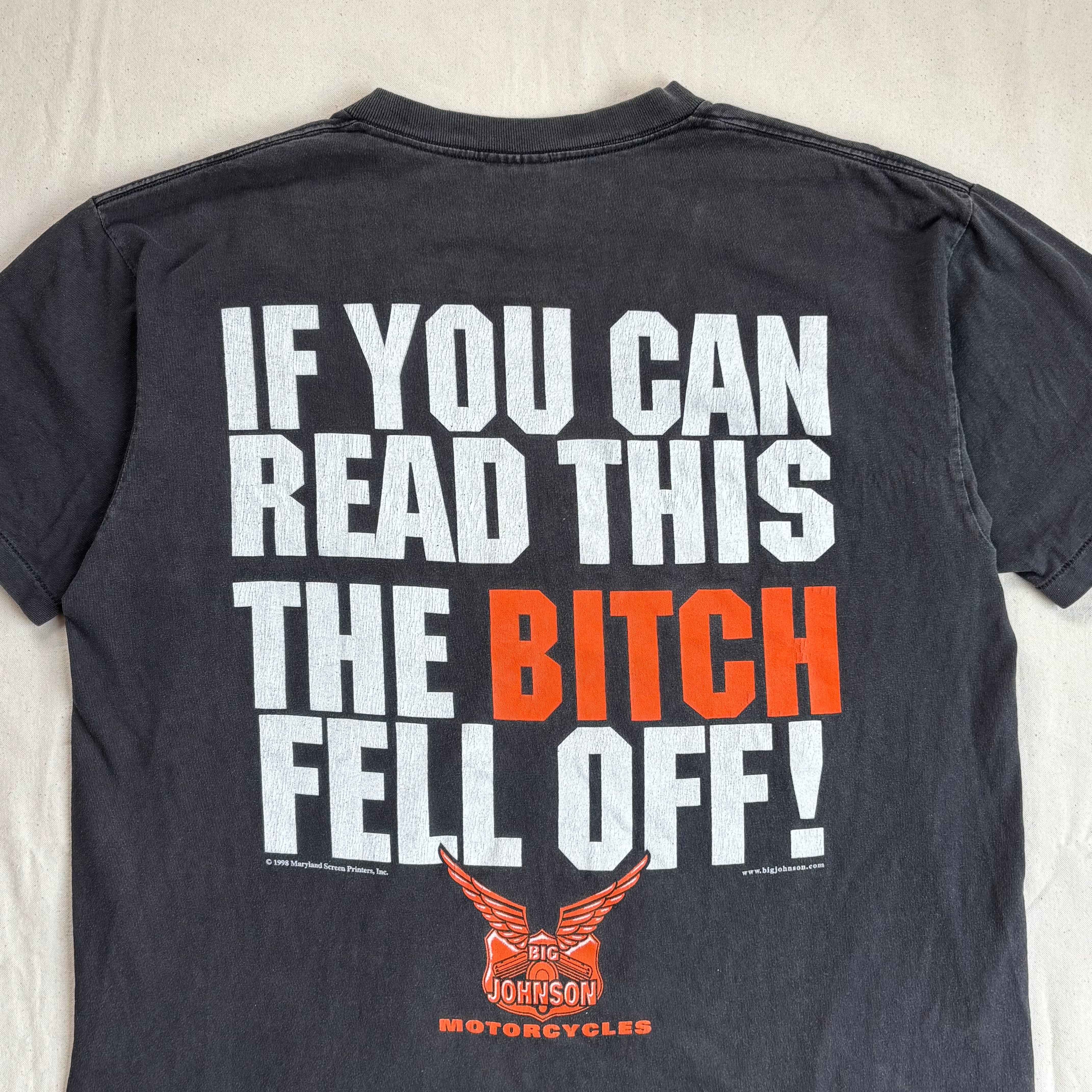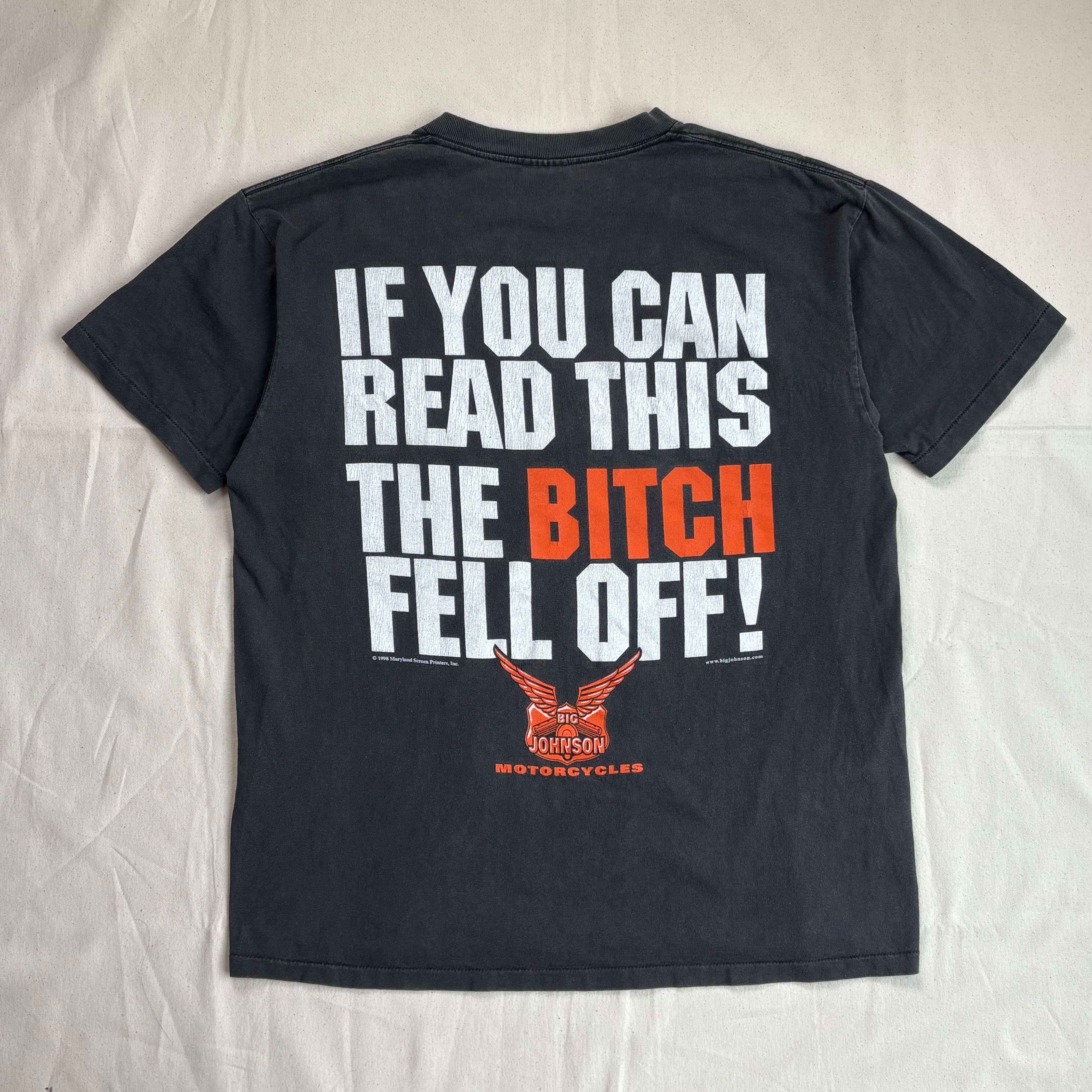 こちらはバックに”If you can read this, The bitch fell off!/このプリントが読めているなら、後ろに乗ったお前の女は既に振り落とされている”というバンパーステッカー調のジョークが描かれた、バイカー感溢れる一枚。