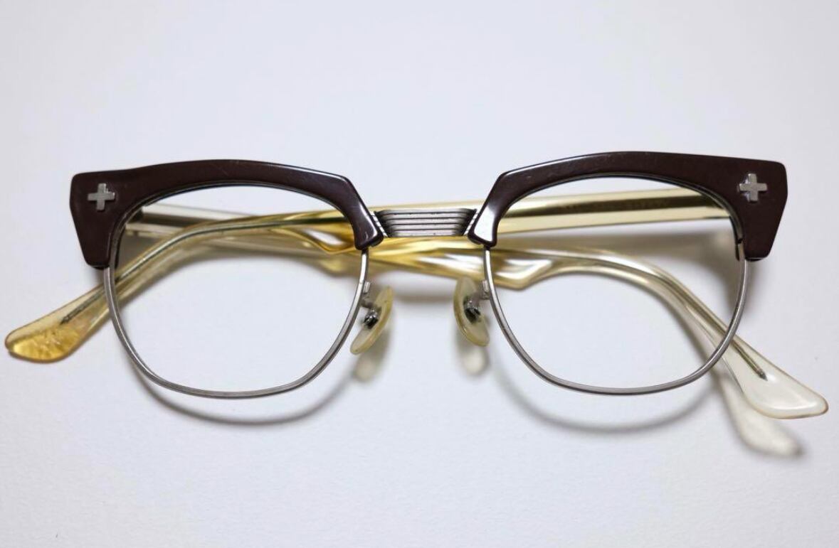 こちらのブローラインタイプは流通数自体が少なく、希少なモデルです。ブリッジのメタルパーツの作り込みやテンプルの形状など、各部魅力あるディテールに溢れます。