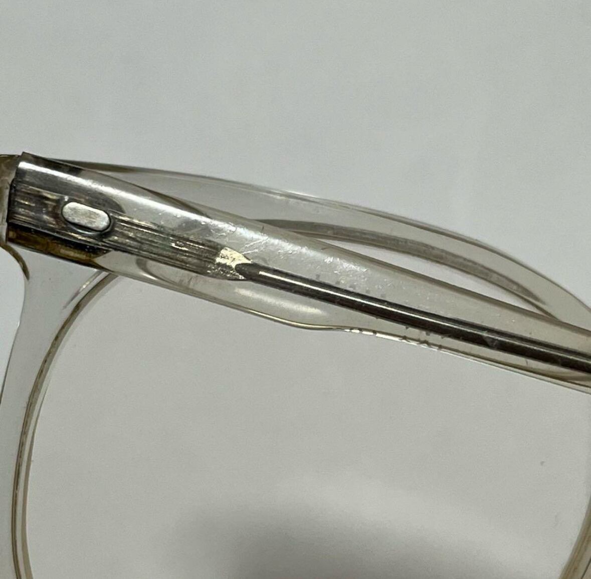 経年によるスレやヤレ、小傷、またややフレームとテンプルの歪み、フレームとレンズの間の汚れ等見えます。