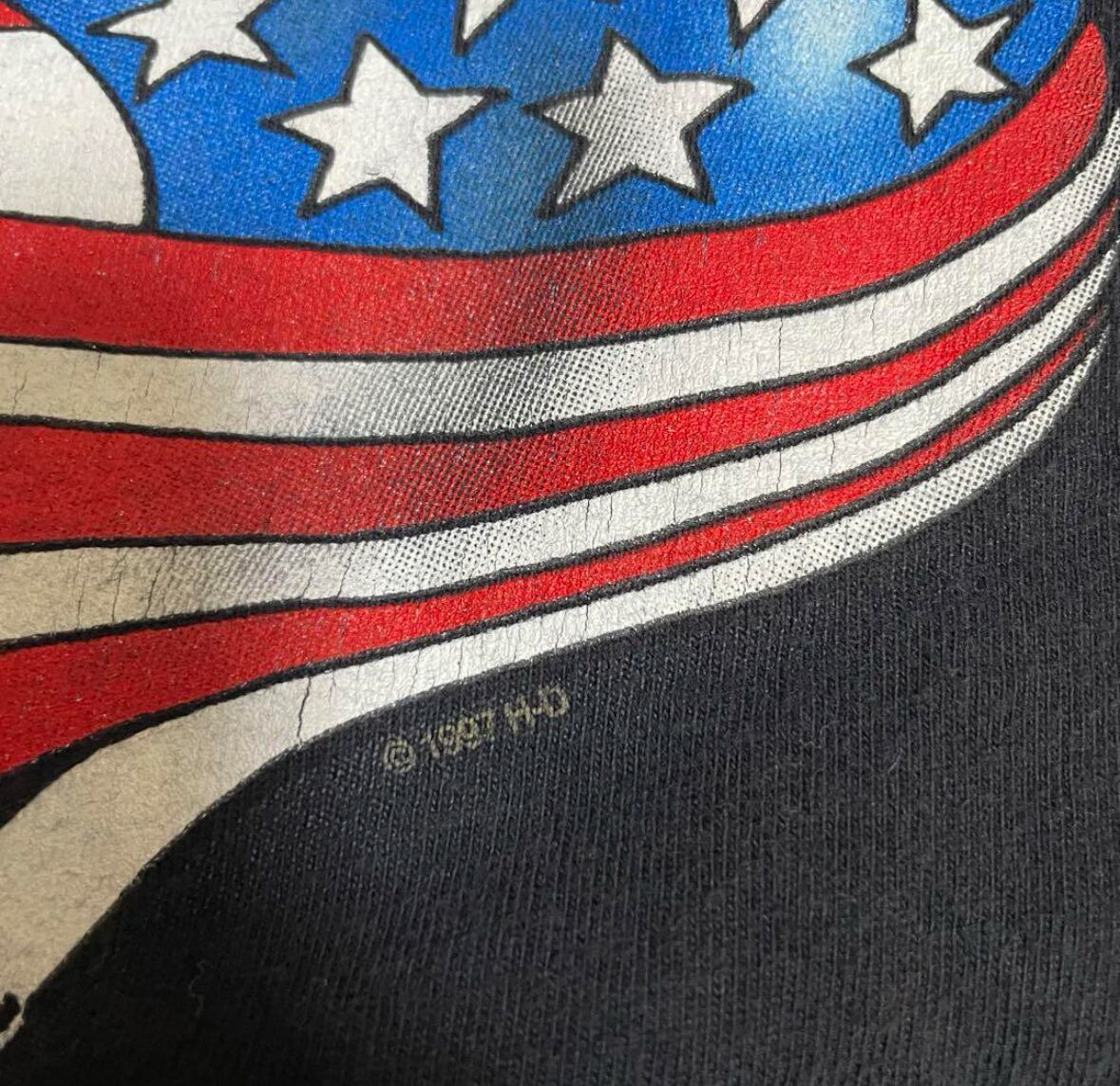 両面共にA面と言えるプリントで、フロントにはイーグルと星条旗ハーレーそしてアメリカ全開のプリント。