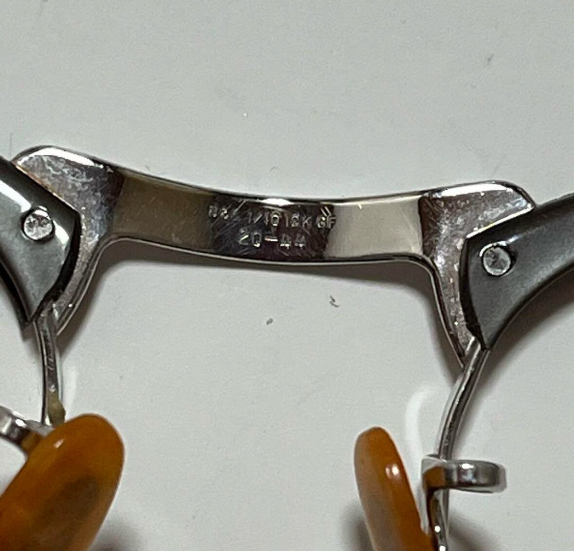 年代なりの小傷やヤレ、左レンズ枠下部の歪み、ノーズパッドの左右の角度の違い、テンプルのアールの違い、またフレームの歪み等が見えます。