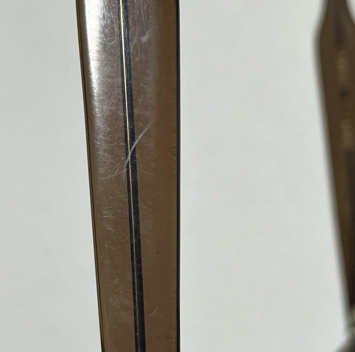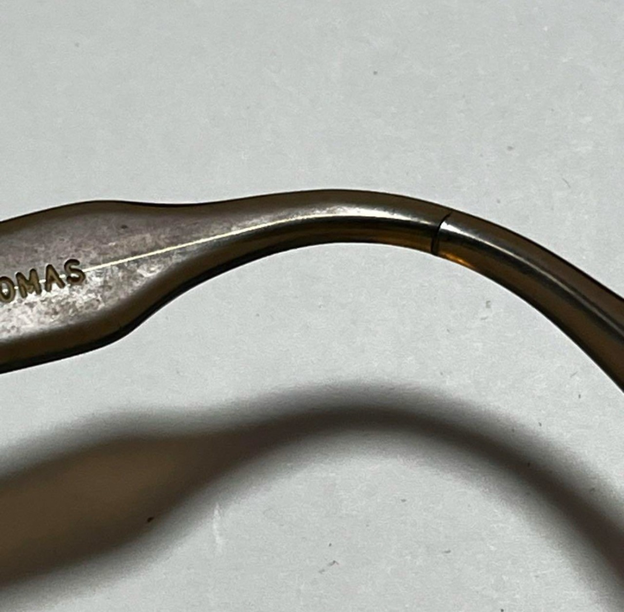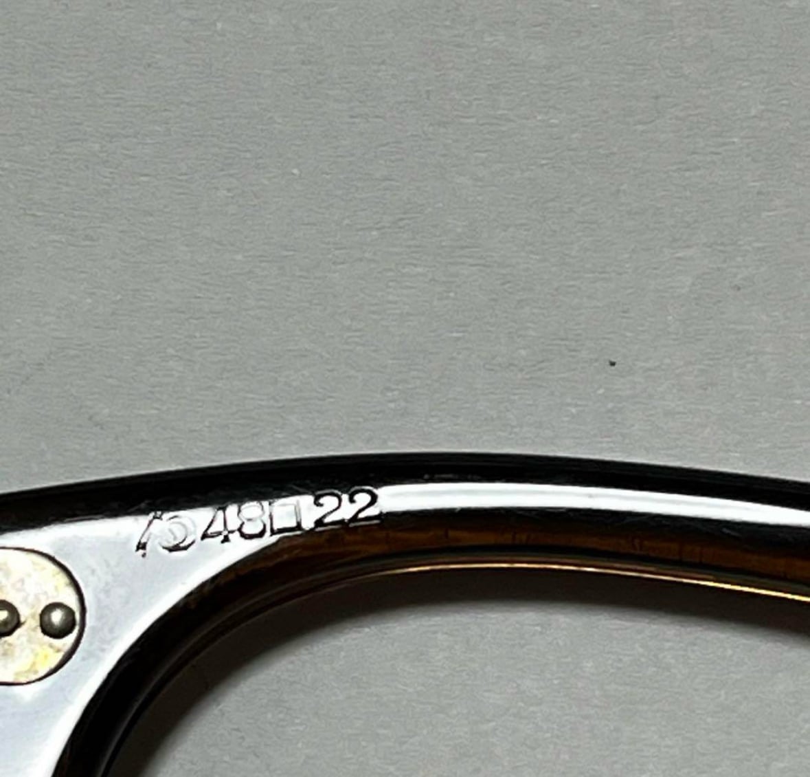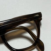 各部年代なりのヤレや小傷、また右テンプルカーブ箇所のわずかなクラック、フレームの反り、また経年によるわずかな酸化臭が見えます。