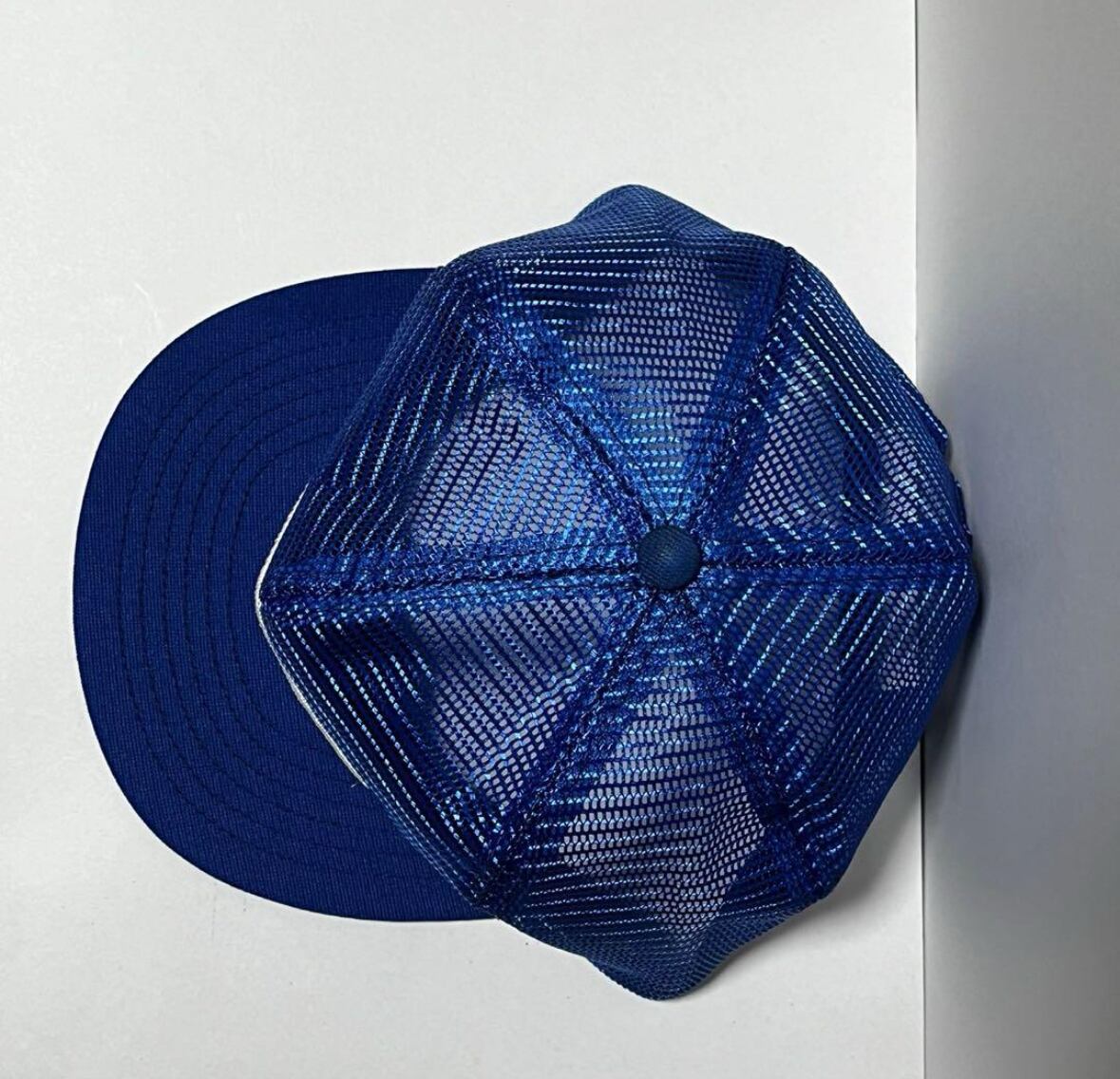 鮮やかなブルーのメッシュボディのフロントパネルに、同色系のオールドイングリッシュフォントが映えるワッペンが施されたシンプルな一点。