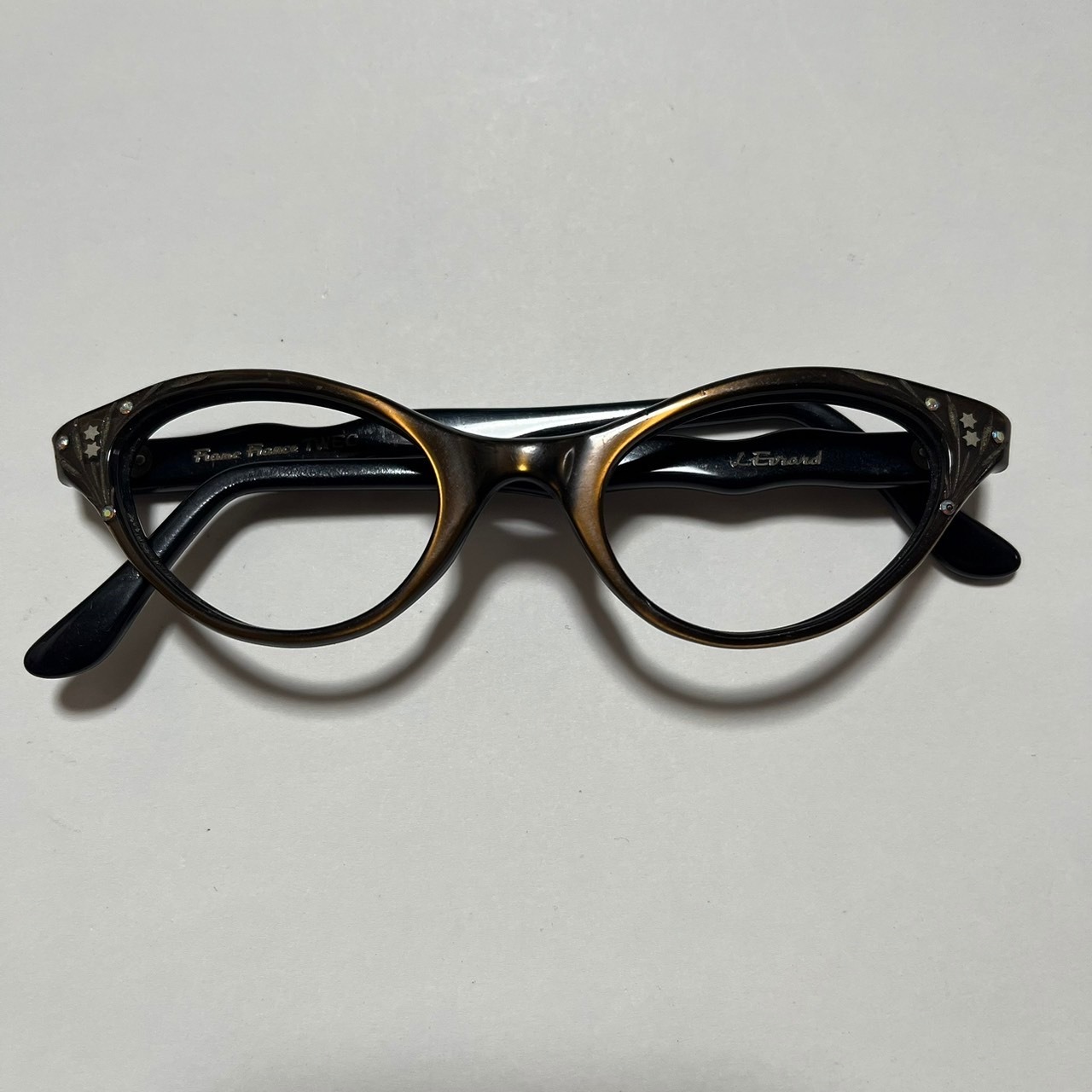 シルエットは両端が吊り上がった、所謂キャッツアイ。この年代ならではのミッドセンチュリー感溢れる要素が雰囲気抜群です。キャッツアイフレームの代表的なディテールである星型のリベットに加え、波型のテンプルの形状等、フランスメイドならではの造りも魅力的。