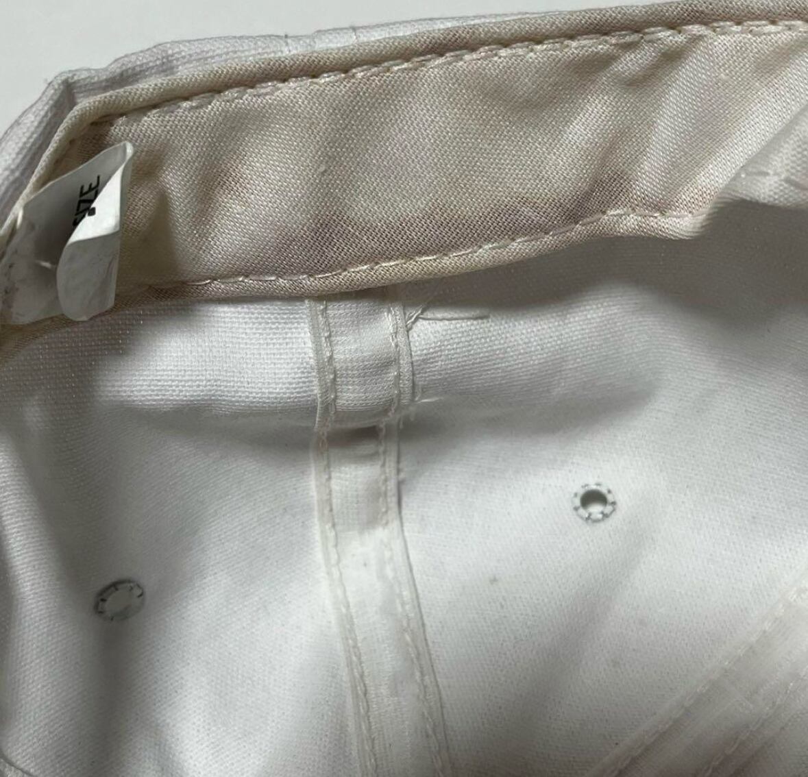 頭頂部付近、ツバ、またスベリ等に汚れは見えますが、古着の白色のアイテムとしては悪く無いコンディションと感じます。