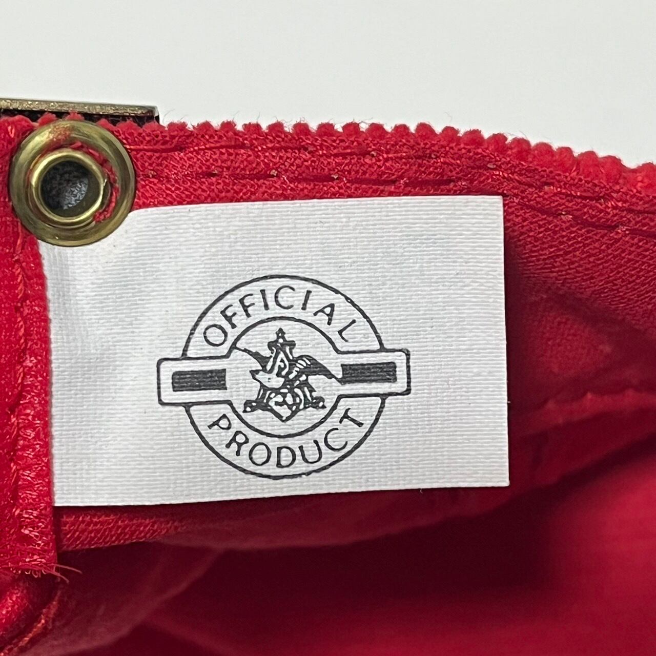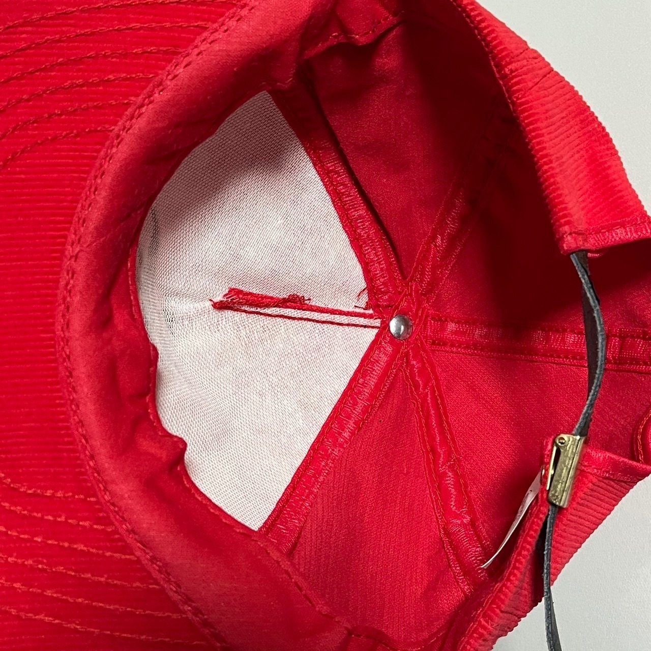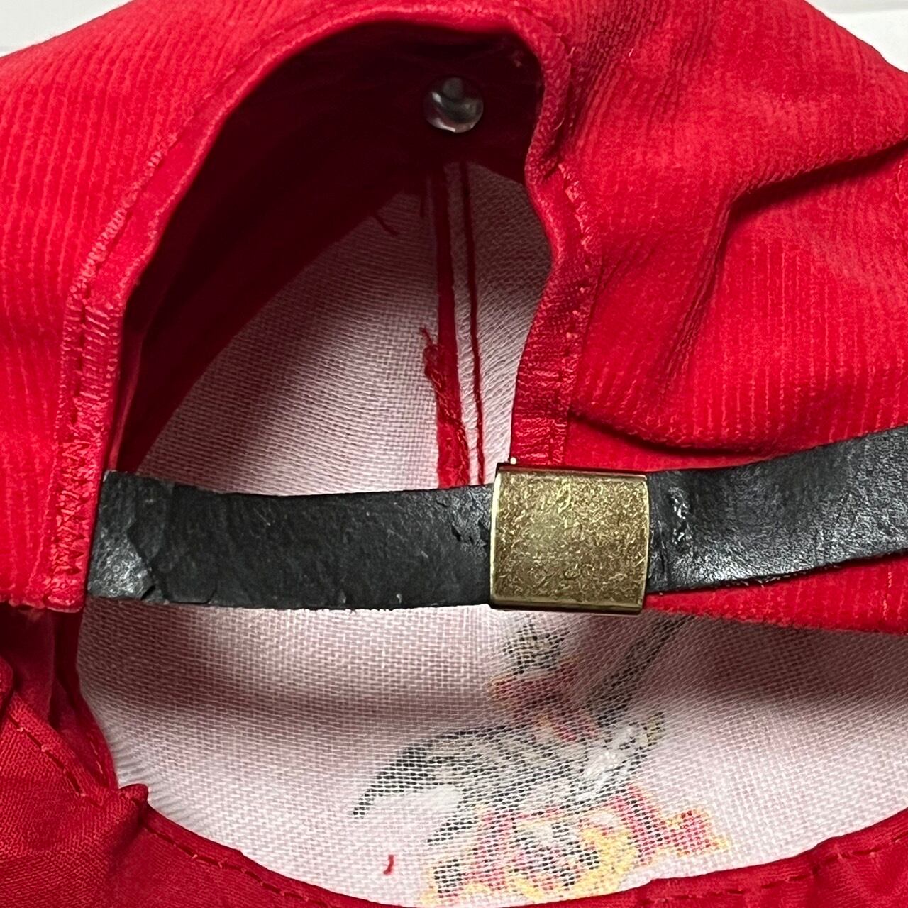ネームや内側のコンディションからデッドストック、またはそれに近いコンディション見えますが、保存時のもの見える刺繍横の汚れ、またレザーストラップの表面の顔料の剥離が見えます。