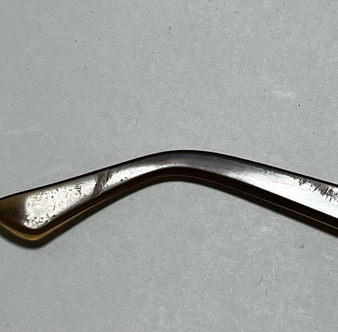フレーム両端にかけてなだらかな吊り上がりが見えるも、全体的には所謂ウェリントン型のシェイプ。フレームとテンプルに施された、2ドットのヒンジ飾りがこの年代らしいディテールです。