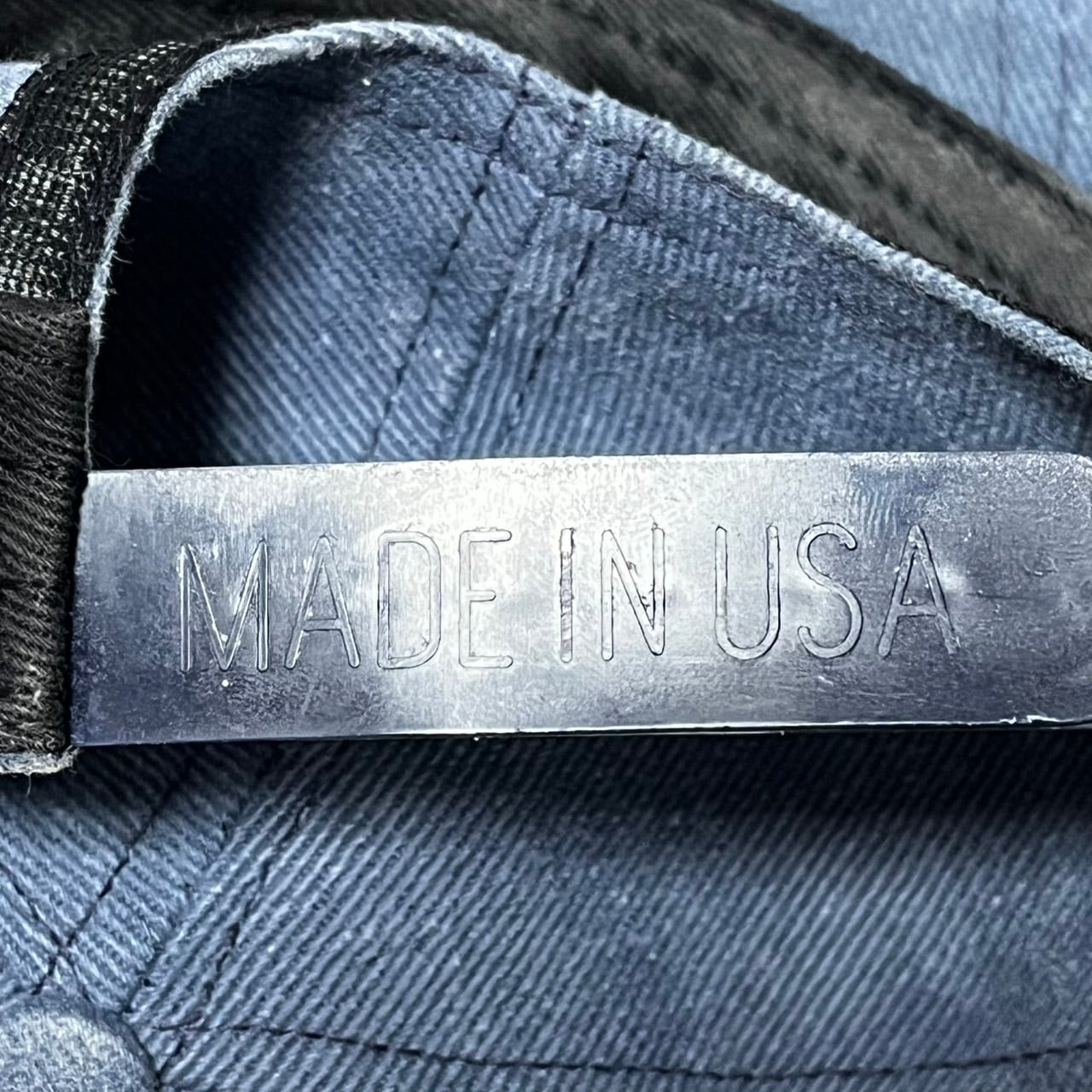 デニム調の素材感が雰囲気が良いボディに、メイン州のディーラー名とバーアンドシールドの刺繍が施された王道のデザイン。